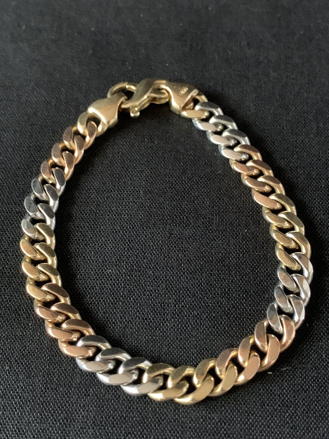 Beautiful panzer gold bracelet in 14 carat red and white gold, with carabiner clasp. The bracelet has enormous dynamism with the combination of the colors of the gold that slide over each other. Therefore, this gold bracelet is a unique piece of jewelry that is rarely offered for sale. It is a piece of jewelry that can be used especially for festive occasions.