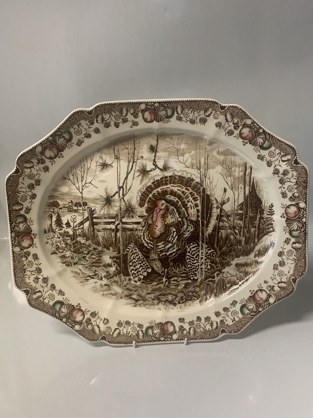 Large serving platter English. Motif: Turkey and forest. His Majesty Johnson Bros. Height: 36.5. Length: 43.8 cm. Nice and well-maintained condition.