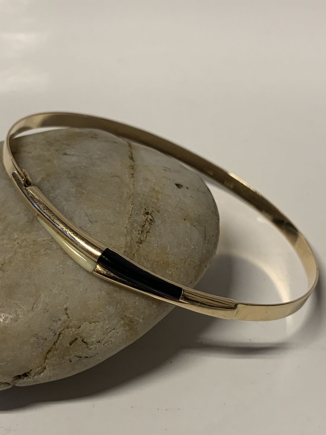 Bracelet in 14 carat gold with white/black stone. The oval bangle is opened/closed by the mortise lock on the side.