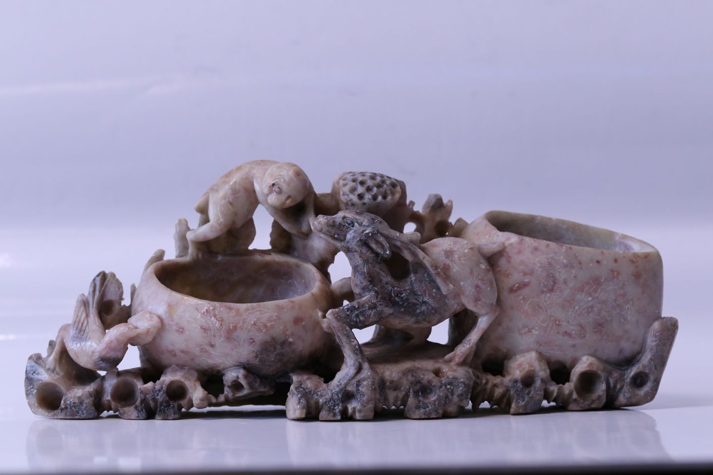 Table sculpture made of soapstone with a beautifully detailed animal motif and two compartments.