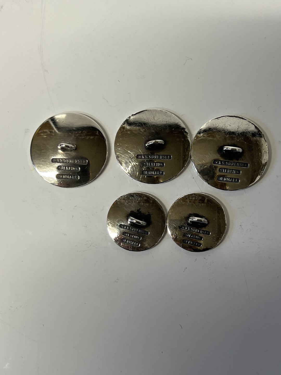 Knapper i sterlingsølv (5stk) Stemplet: Sterling Denmark. Sølvsmed: W.&S.Sørensen. 3 stk Diameter 2 cm. 2 stk Diameter 1,5 cm. Brugt, men velholdt.