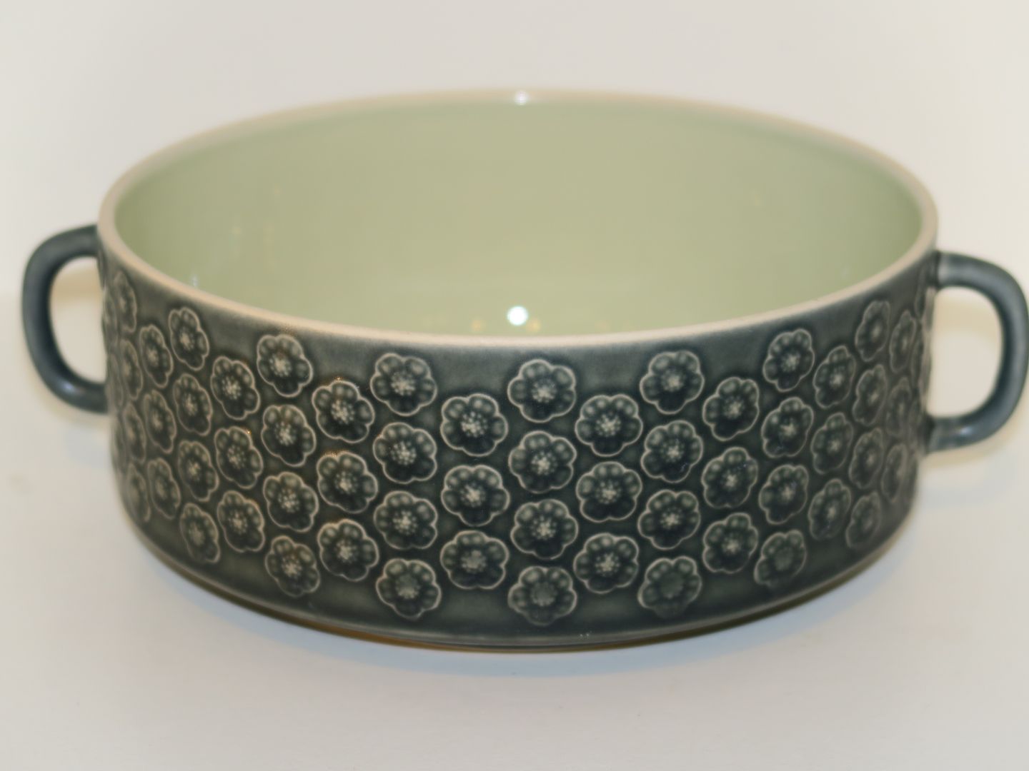 Kronjyden, Azur stentøj, skål med håndtag der mangler et låg Designet af Jens Harald Quistgaard. Diameter 18,7 cm. Perfekt stand uden fejl.