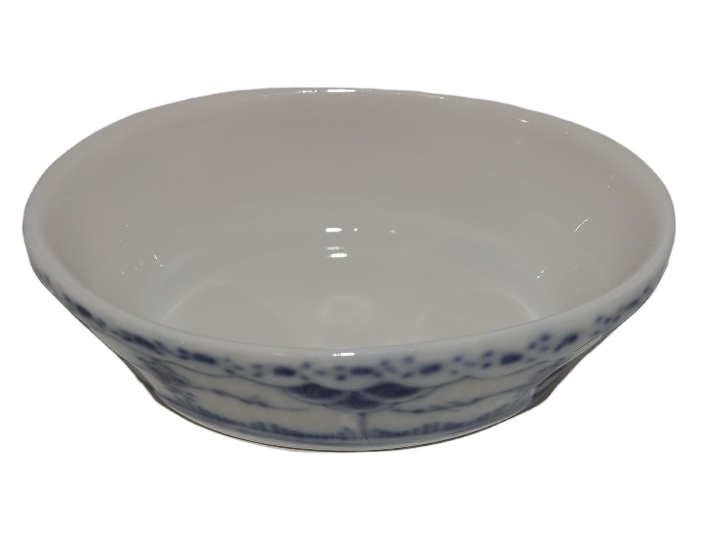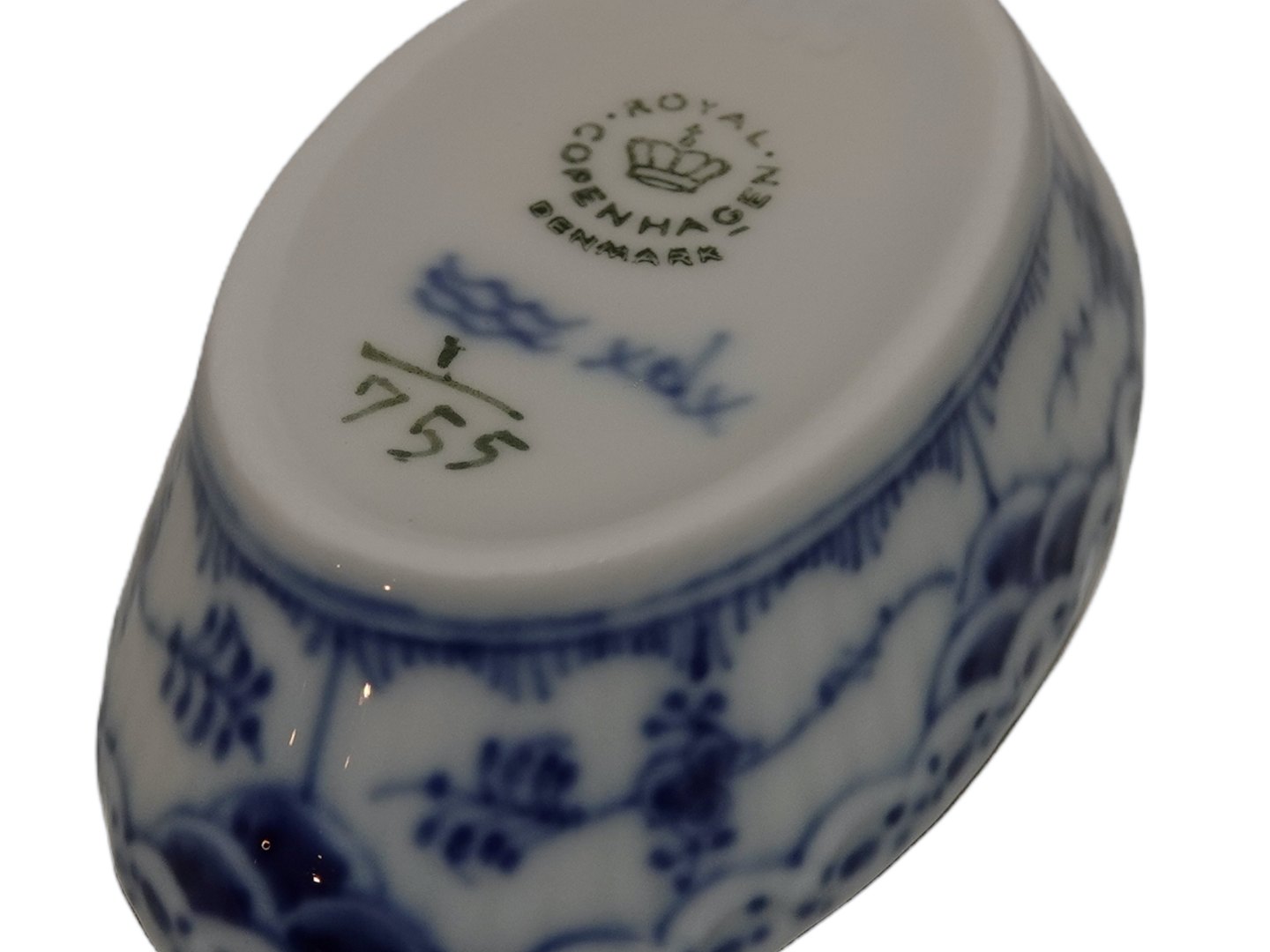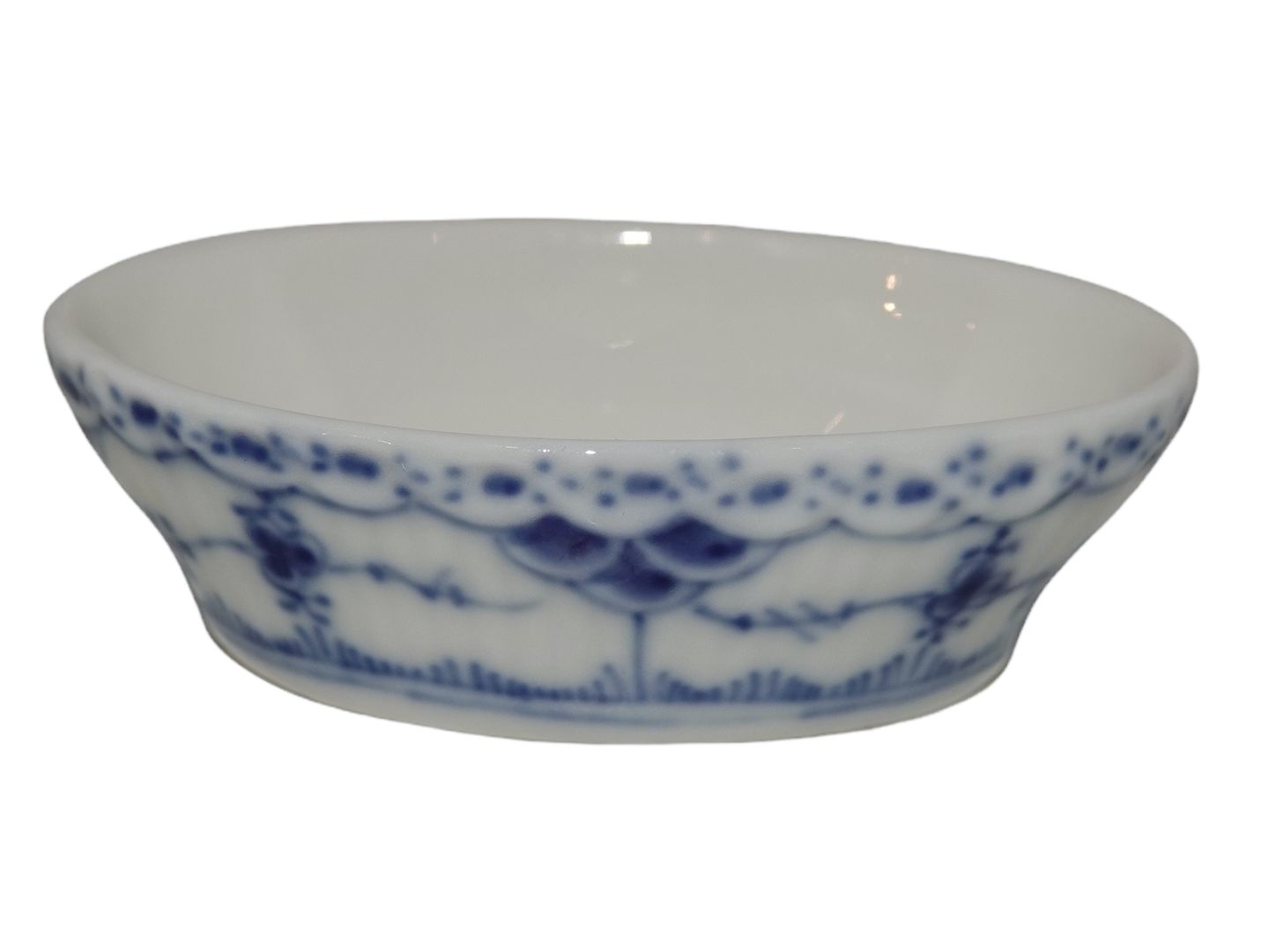 Royal Copenhagen Blue Fluted Half Lace, oval salt jar. Decoration number 1/755. Factory first. Length 7.0 cm. Perfect condition with no chips, cracks or repairs.