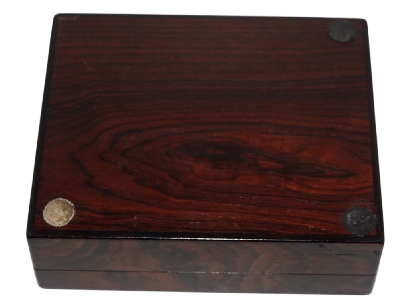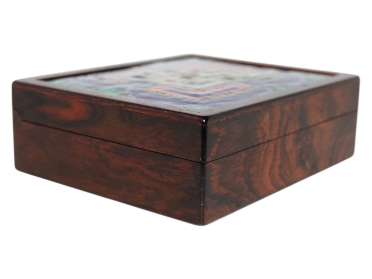 Alfred Klitgaard, lidded rose wood box with Bodil Eje enamel. Marked "KLITGAARD DENMARK". Measures 11.4 by 9.4 cm., height 3.7 cm. Excellent condition. Very well kept.
