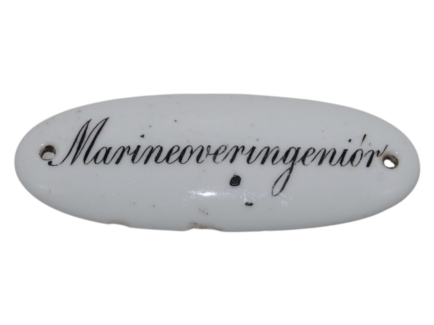 Royal Copenhagen white sign with black text: "Marineoveringenør".