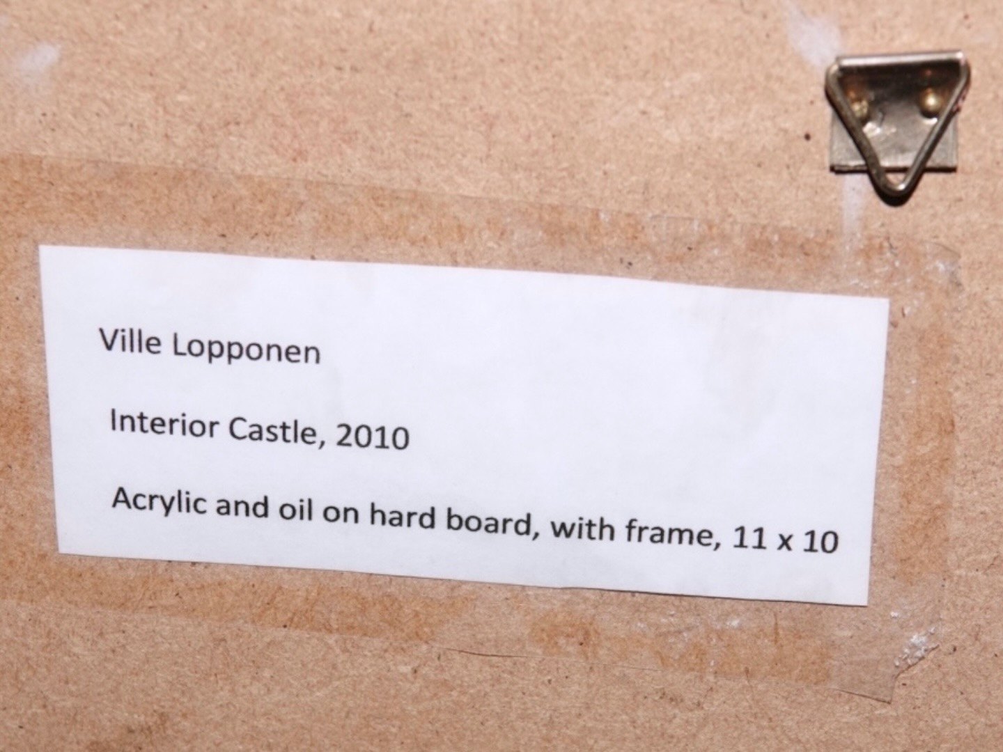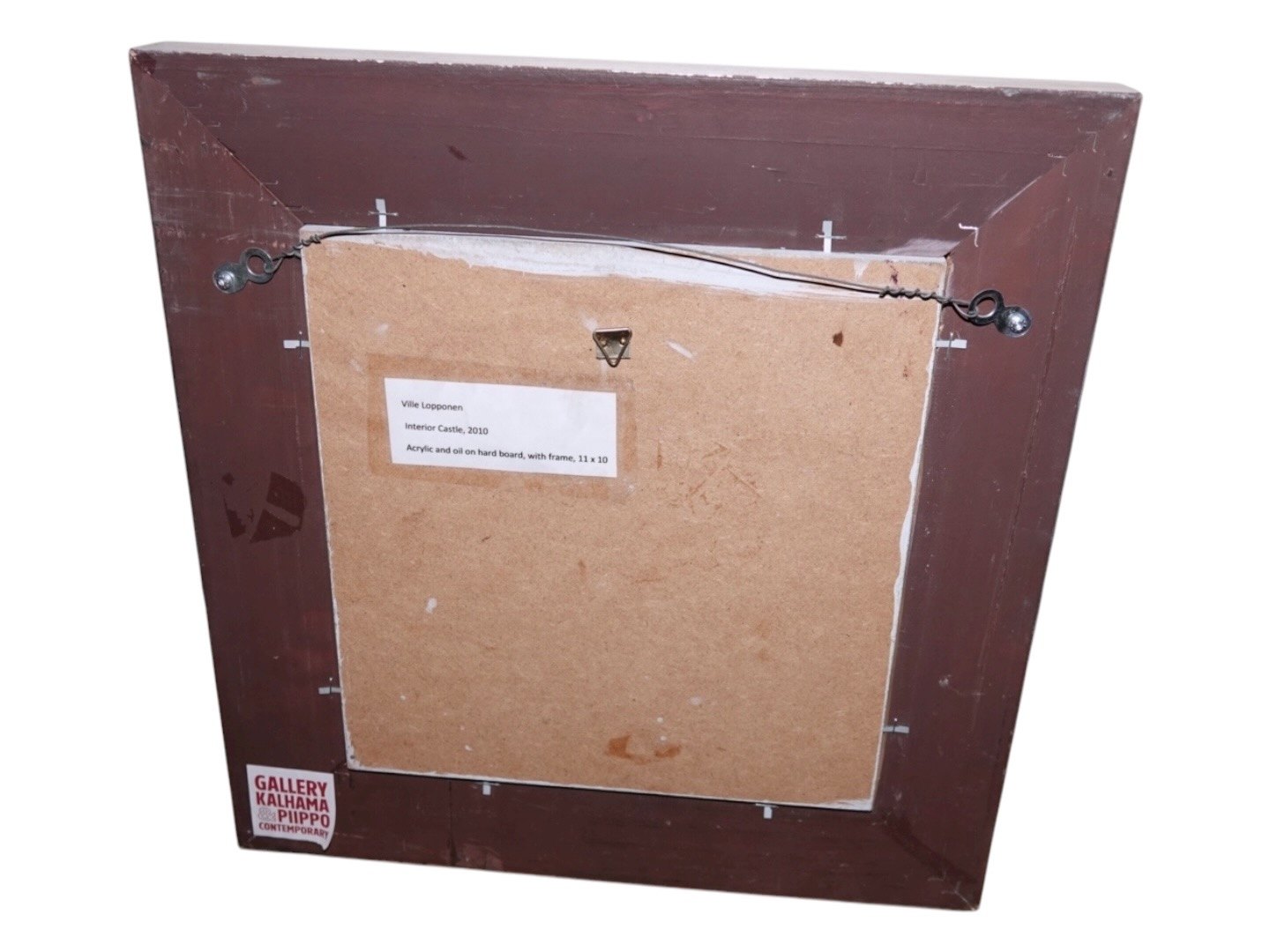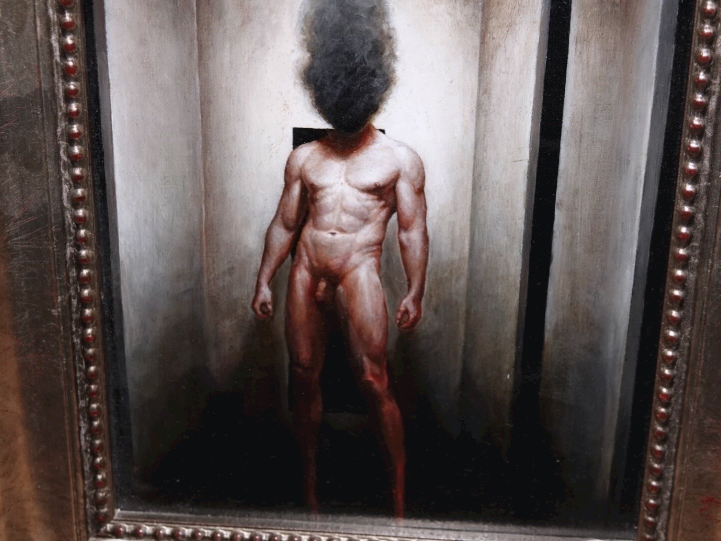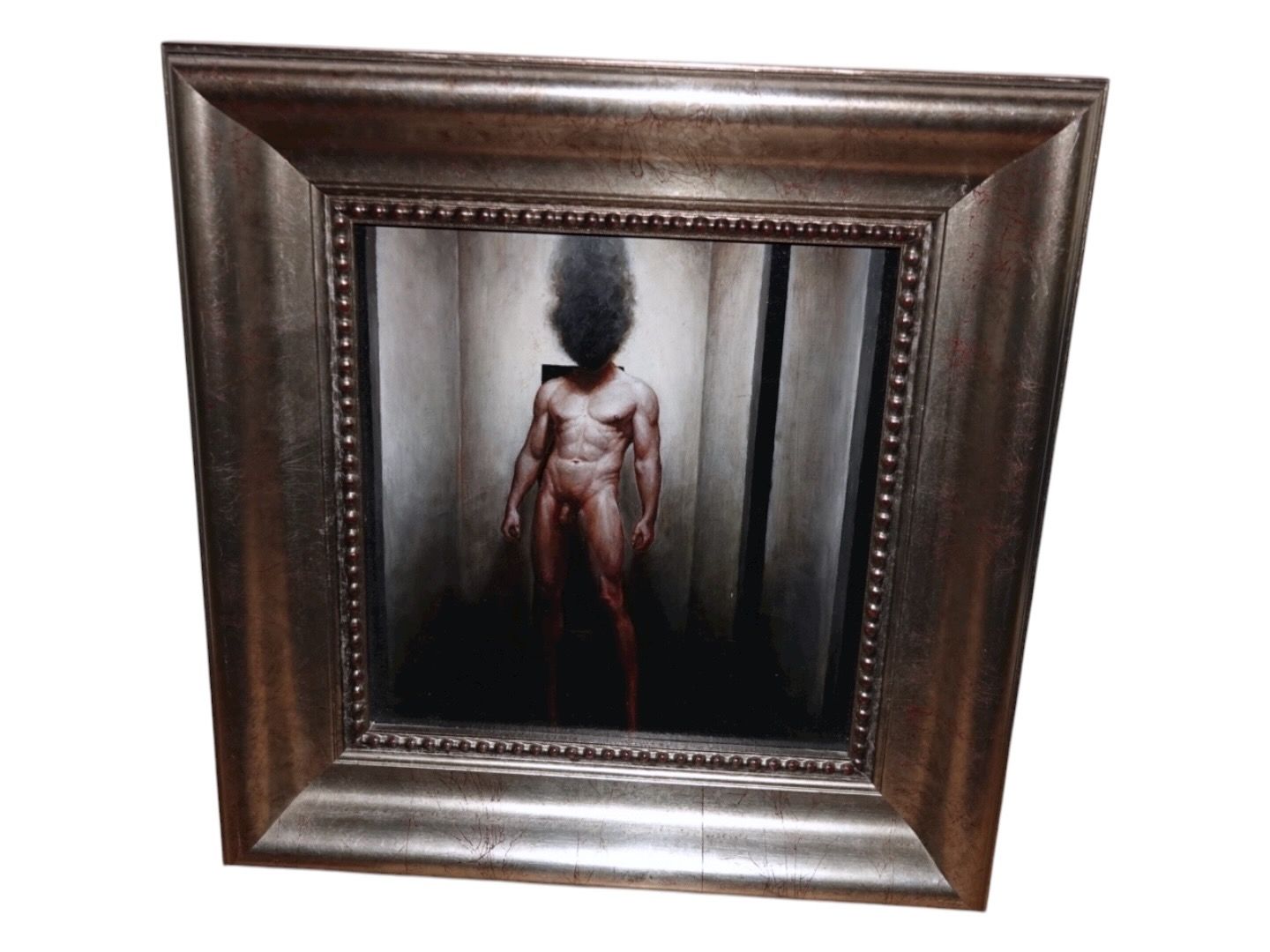 Ville Löppönen (born 1980 in Finland) acrylic and oil painting of a nude man in a wide silver frame from 2010.