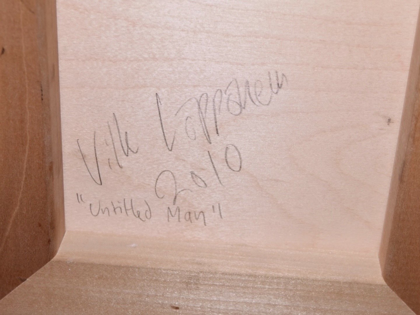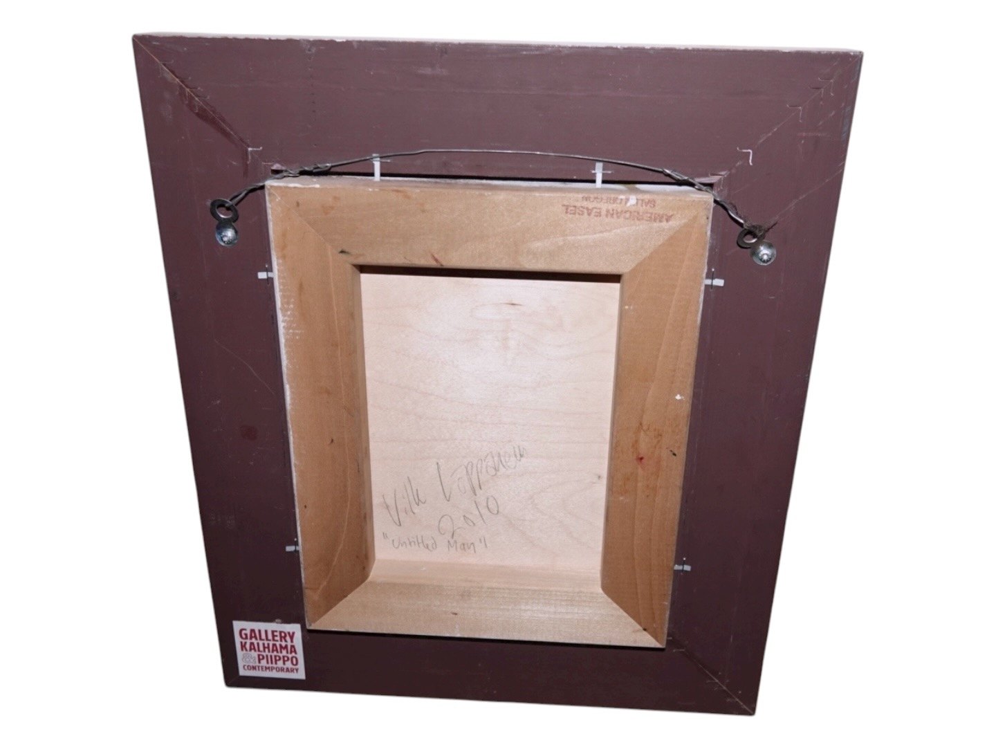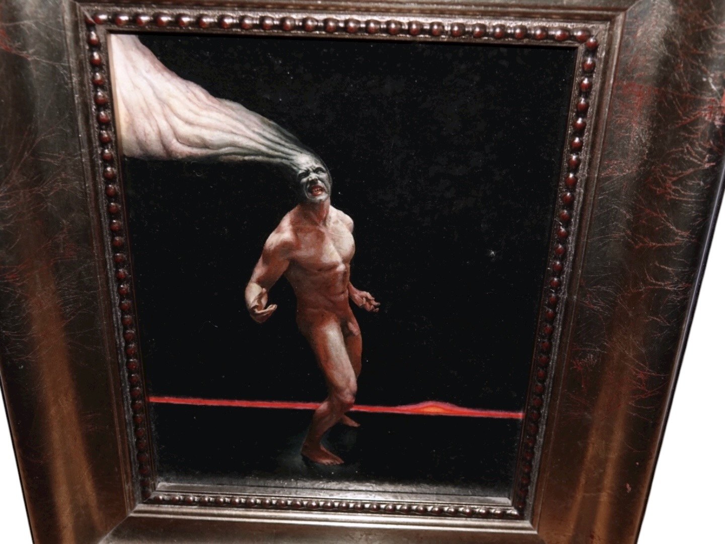 Ville Löppönen (born 1980 in Finland) acrylic and oil painting of a nude man in a wide silver frame from 2010.