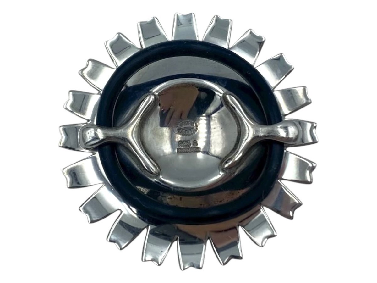 Georg Jensen sterling silver, black Daisy pendant in leather string. Diameter of the pendant is 4.2 cm., the string measures 42.0 cm. Excellent condition.