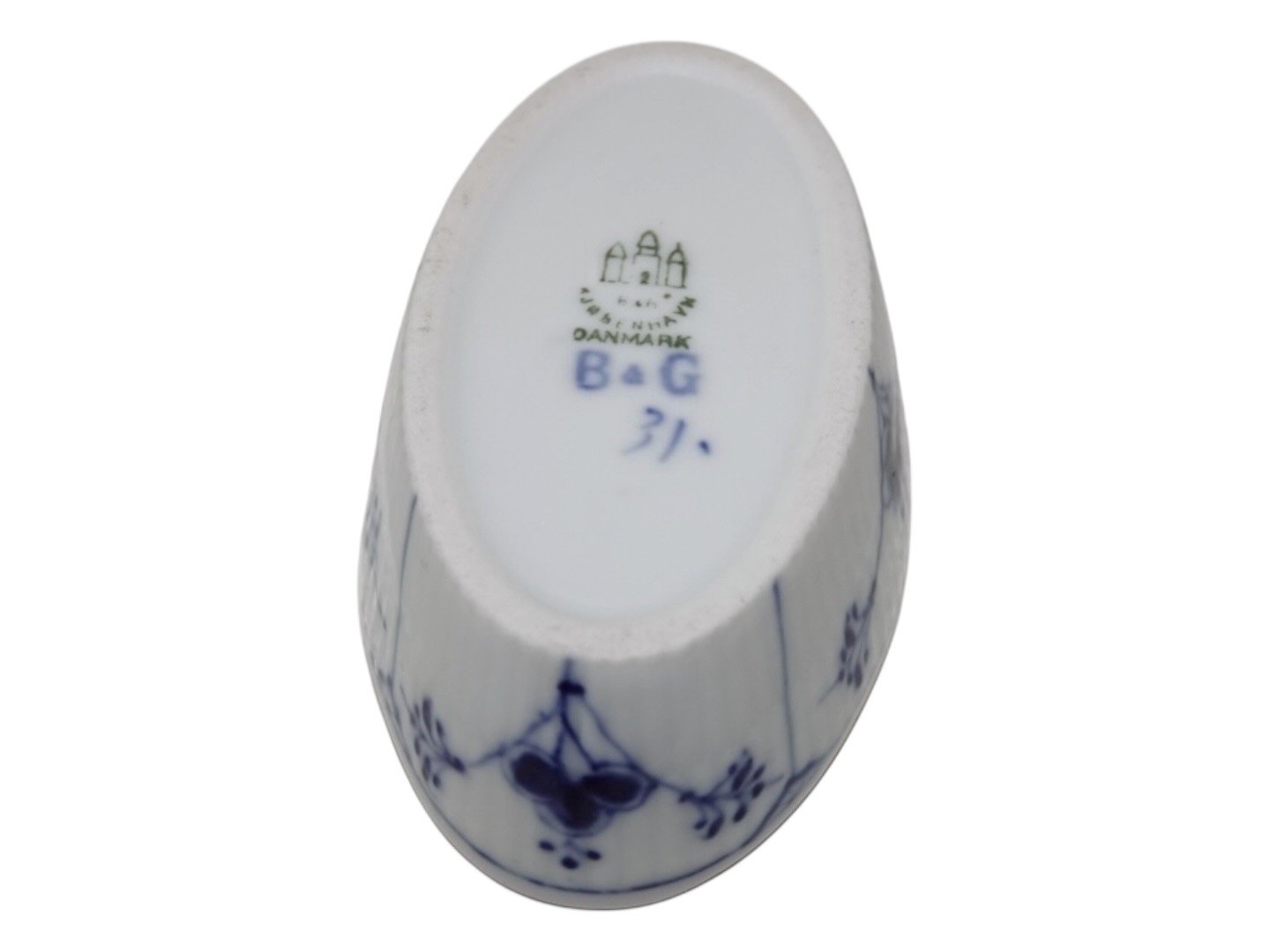 Bing & Grondahl Blue Traditional (Blue Fluted), large salt jar. The factory mark tells, that these were made between 1915 and 1948. Factory first. Length 9.2 cm. Perfect condition with no chips, cracks or repairs.