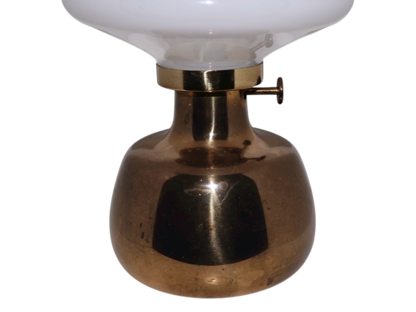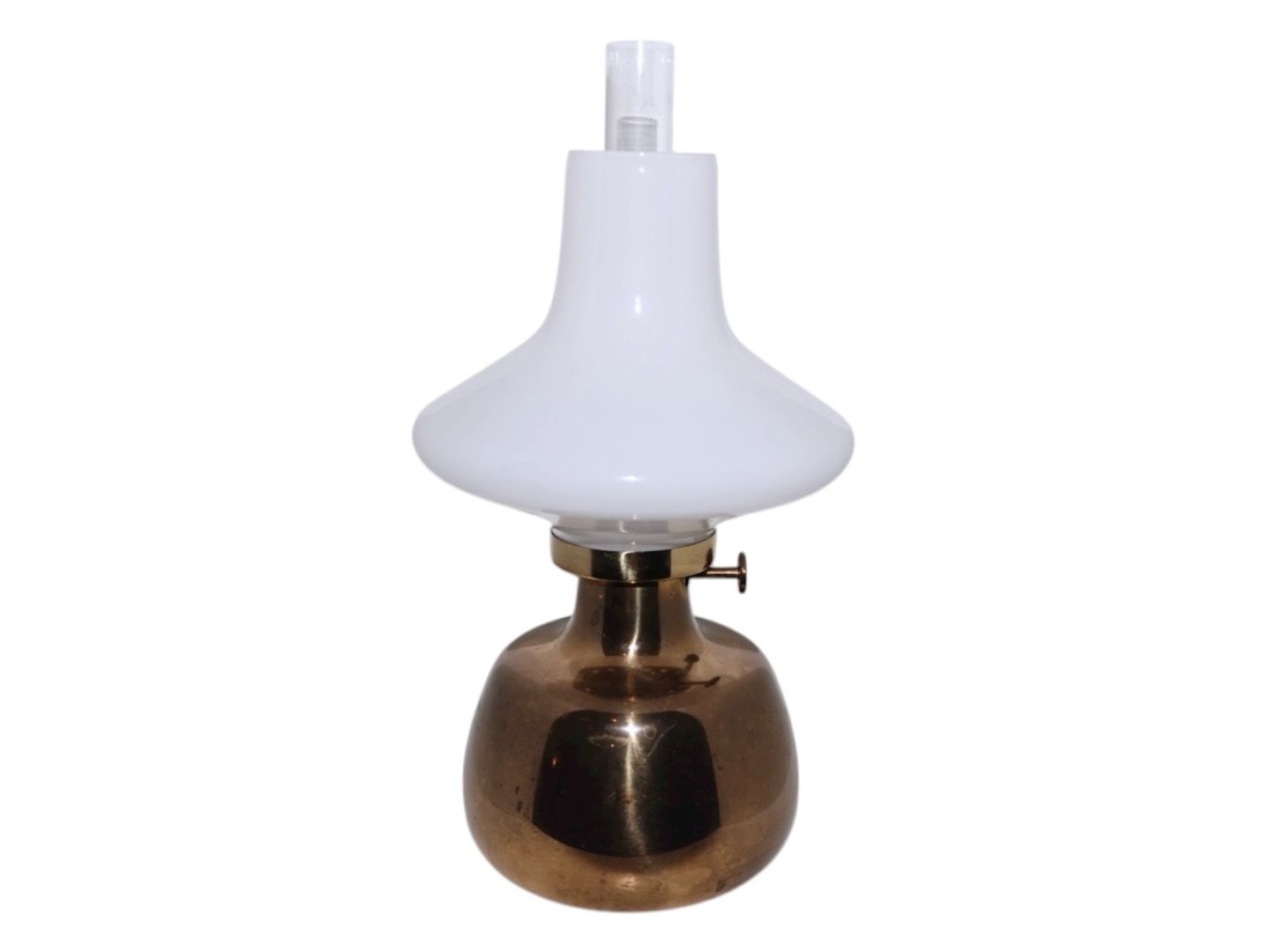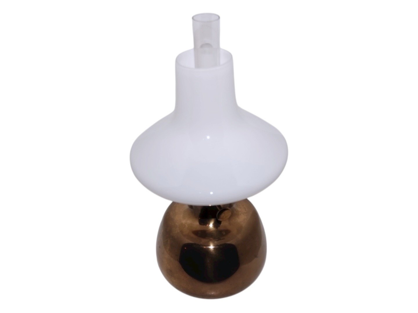Henning Koppel. Petronella oil lamp with white opal glass shade from Holmegaard. Height 32 cm. The handle for the wick is stock and the brass part is patinated in the color otherwise excellent condition.