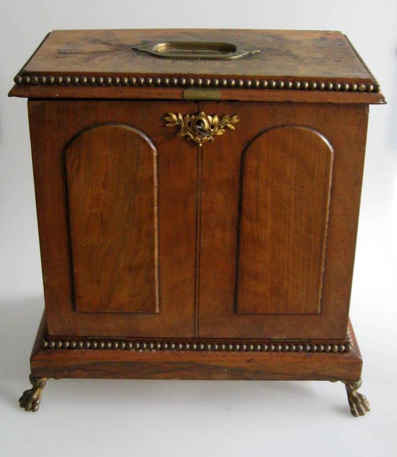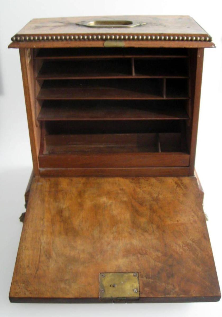 English writing box, 19th century. Walnut. With brass mounting, lion legs and handle. With door with decorations and lock. Inside with several shelves and rooms. H: 29 cm. B: 28 cm. D: 18 cm.
