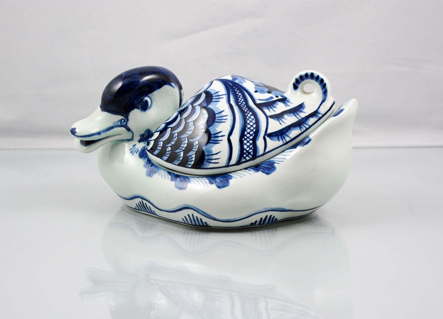 Bonbonniere i form af en and (nr. 3043/1058) fra Aluminia. Lavet til stellet Tranquebar. Den er i meget pæn stand.