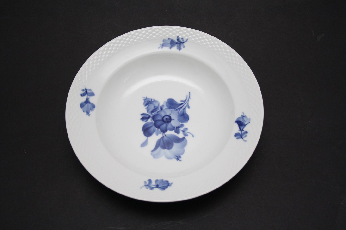 Text available in Danish: Royal Copenhagen, Blå blomst flettet, dyb frokost- eller desserttallerken. Nr. 10/8105. Diameter 21 cm.