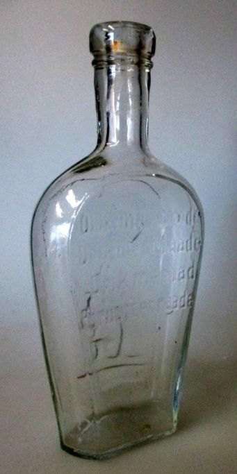 Flask - schnapps bottle - Funen Glassworks, 1903. Denmark. Clear glass. Decoration with Bissen's brave soldier. Height .: 16.2 cm. On the back: Drink with pleasure. Drink in measure. Drink with common sense ". H: 16.2 cm. At the bottom: 1/8 L. - equivalent to 1/4 pot.