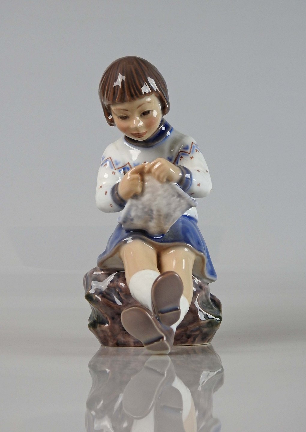 Figur af strikkende pige i blå kjole og strikketrøje siddende på sten af Dahl Jensen nr. 1197