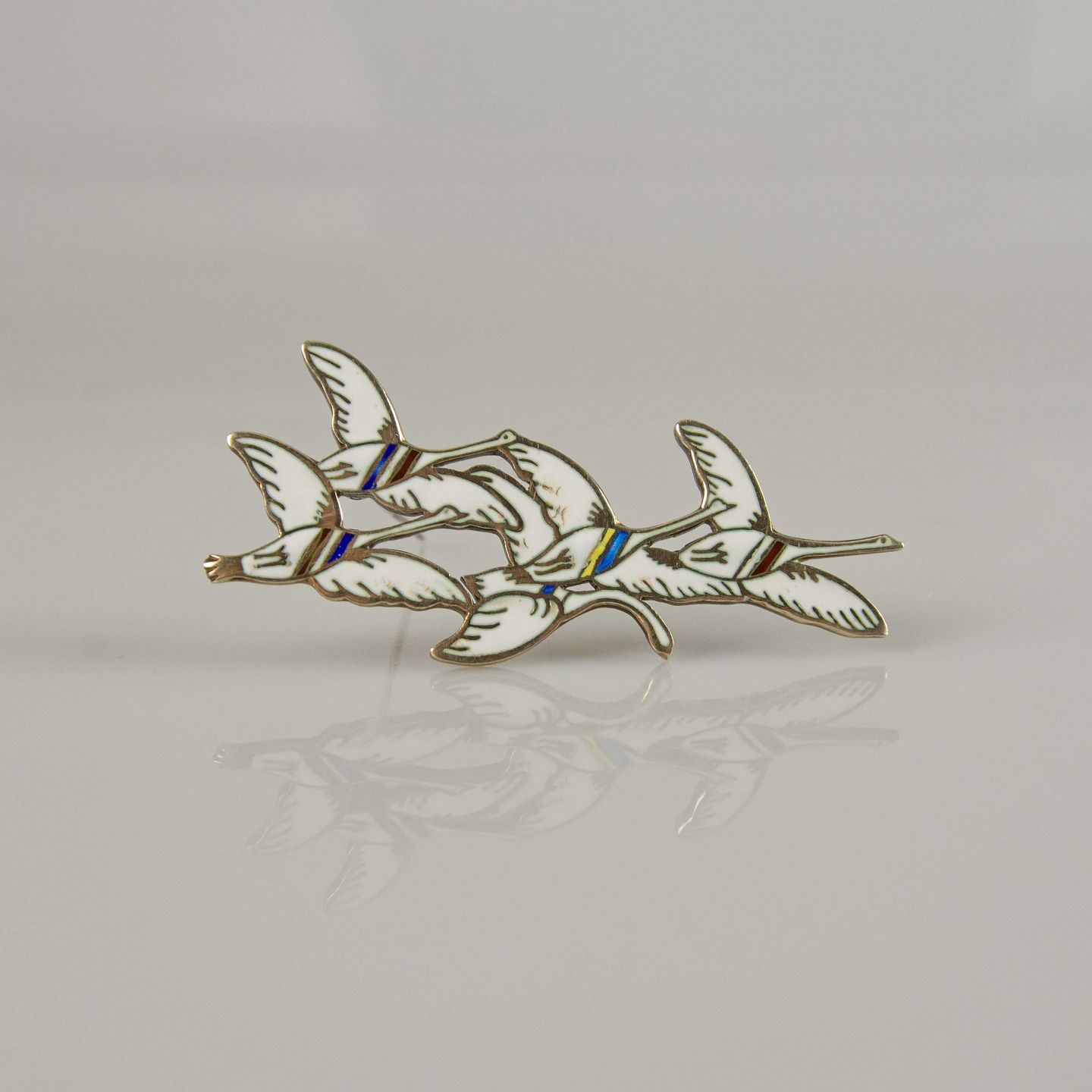 Broche i sølv og emalje med motiv af fem flyvende svaner