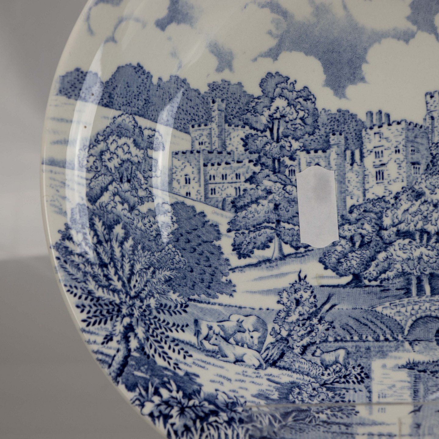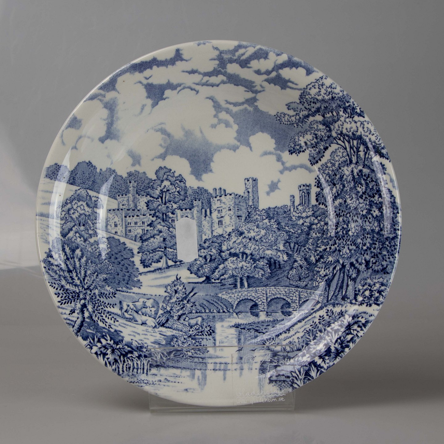 Tallerken i lys fajance med blådekoreret slotsmotiv.