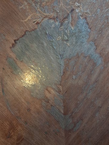 Sofabord i fineret og lakeret mahogni med intarsia af rosentræ fra 1980erne.