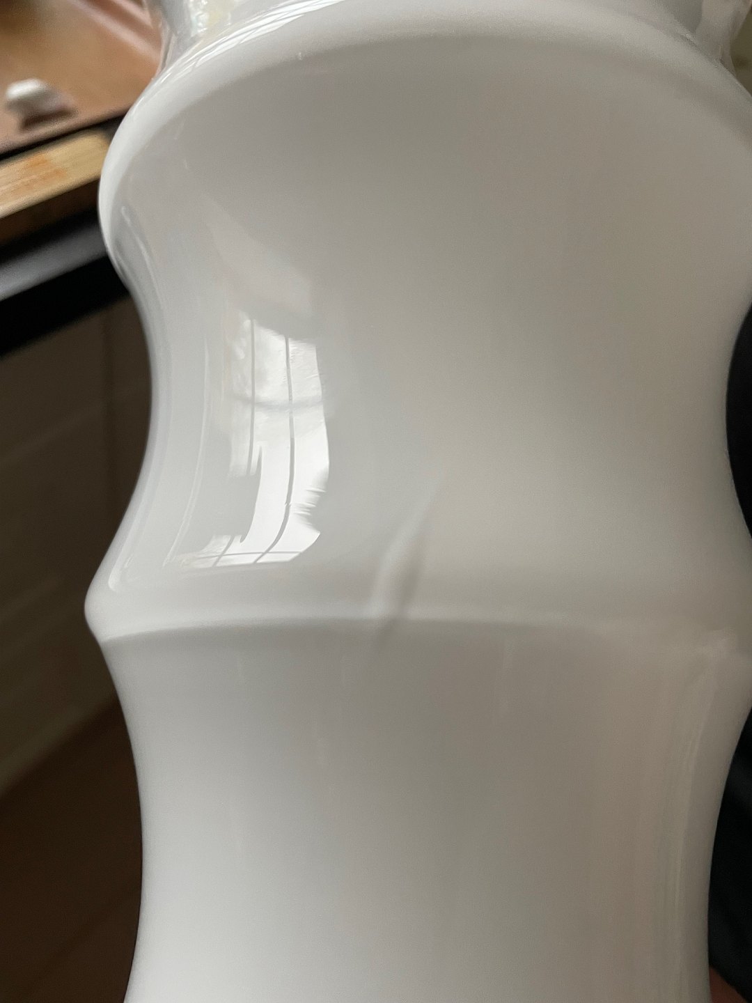 Text available in Danish: Holmegaard, Karen Blixen opalinehvid vase stor størrelse. Designet af Anja Kjær i 2000. Vasens form er inspireret af afrikanske kvinders hals og armringe. Højde 30,5 cm. Diameter 17,5 cm. OBS der er 2 indvendige produktionsfejl. Den øverste som en revne i glasset, den nederste som en boble, den kan ses udefra. Pris: 400 kr. stk. Lager: 1