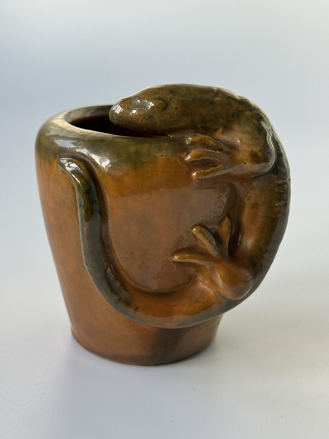 Miniature skønvirke / Art Nouveau vase med klatrende firben / øgle, 10 cm høj