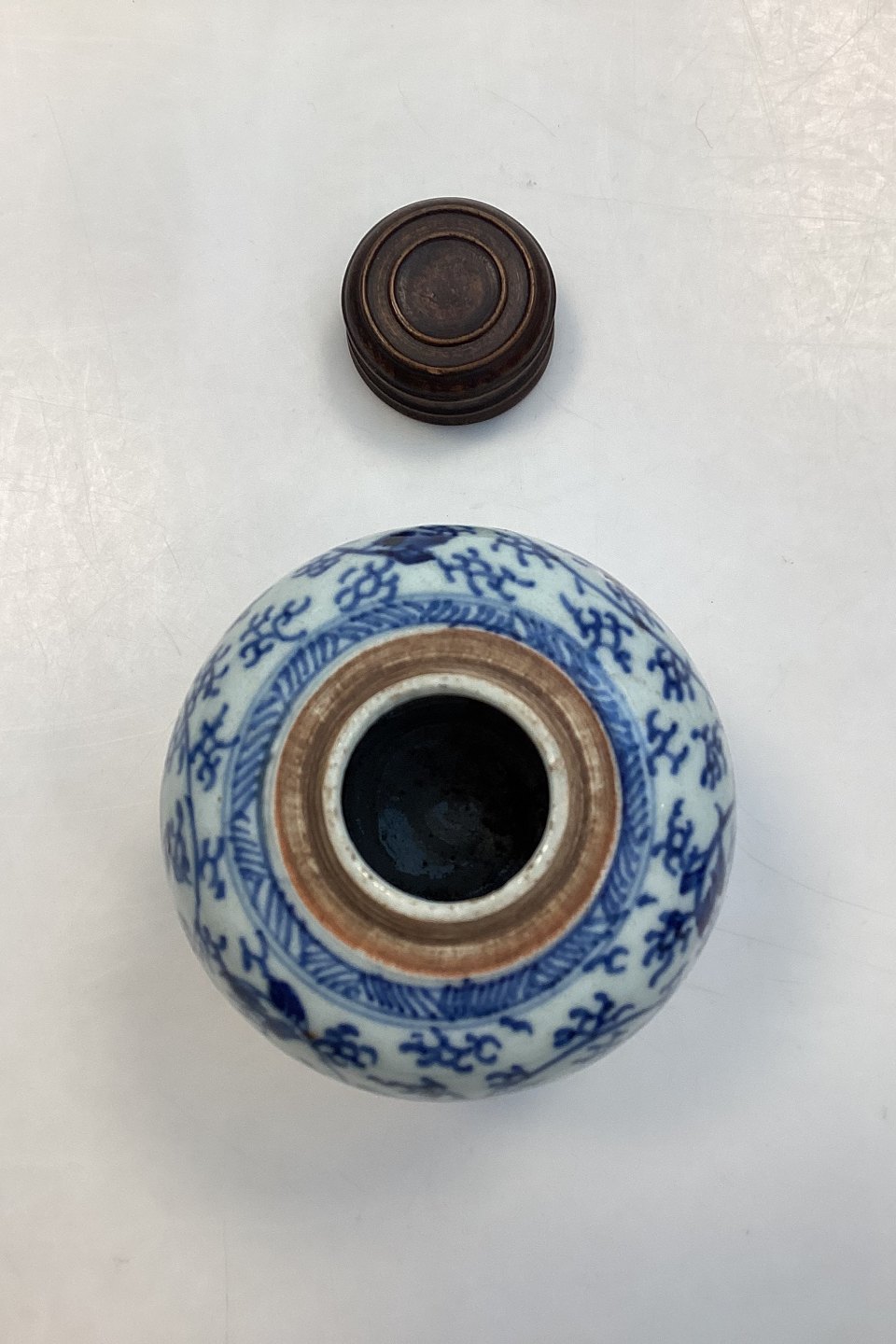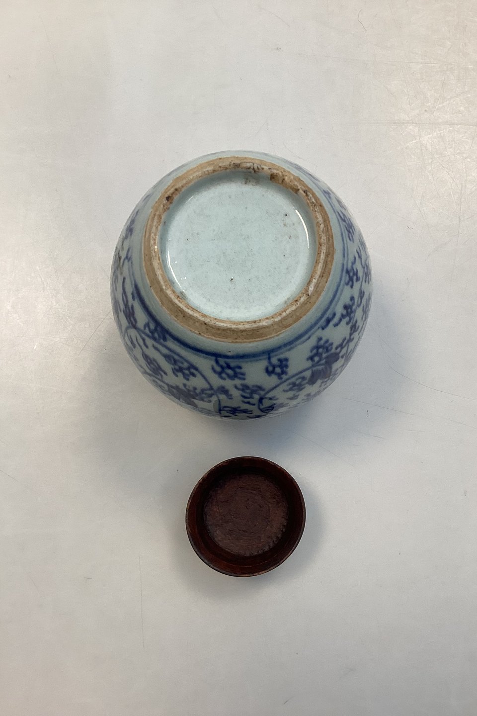 Chis on the bottom of the vase and on the top of wood lid.