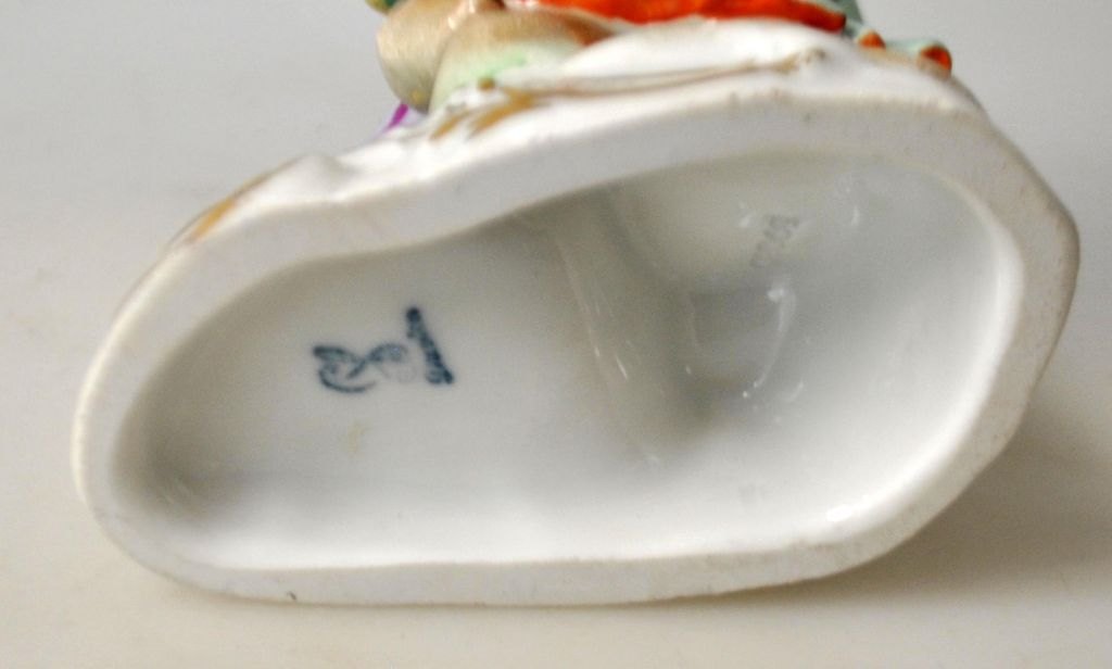 Porcelain figure of peasant boy with chickens, Potschappel, Dresden, Germany. 20th century. Painted and gilded. H: 11 cm. W: 6 cm. L: 9.5 cm. Stamped: SP Dresden 5908D.