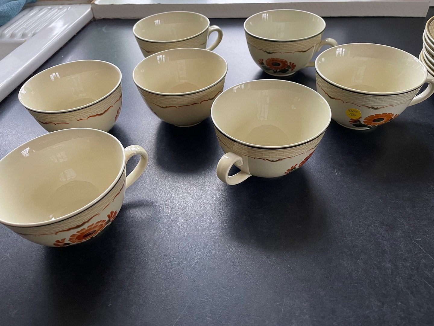 Text available in Danish: Aluminia, Morgenfrue. Designet af Niels Thorsson. Produceret i perioden 1934-1967. Luftmalet. Tekop. Nr. 1782. Højde 5,5 cm. Diameter 9,5 cm. Underkop diameter 15 cm. Flot stand. Pris: 150 kr. stk. Lager: 7