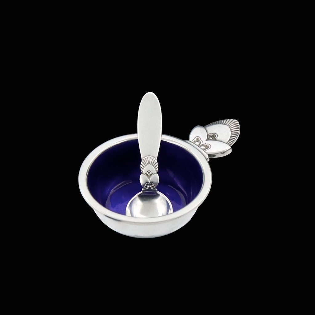 Georg Jensen. Sterling Silver Salt Cellar #102 with Enamel and Spoon 103 - Cactus.