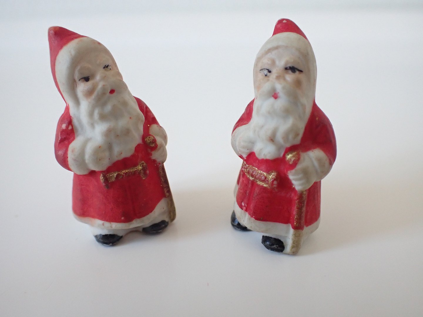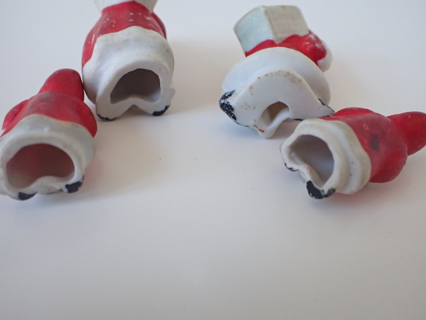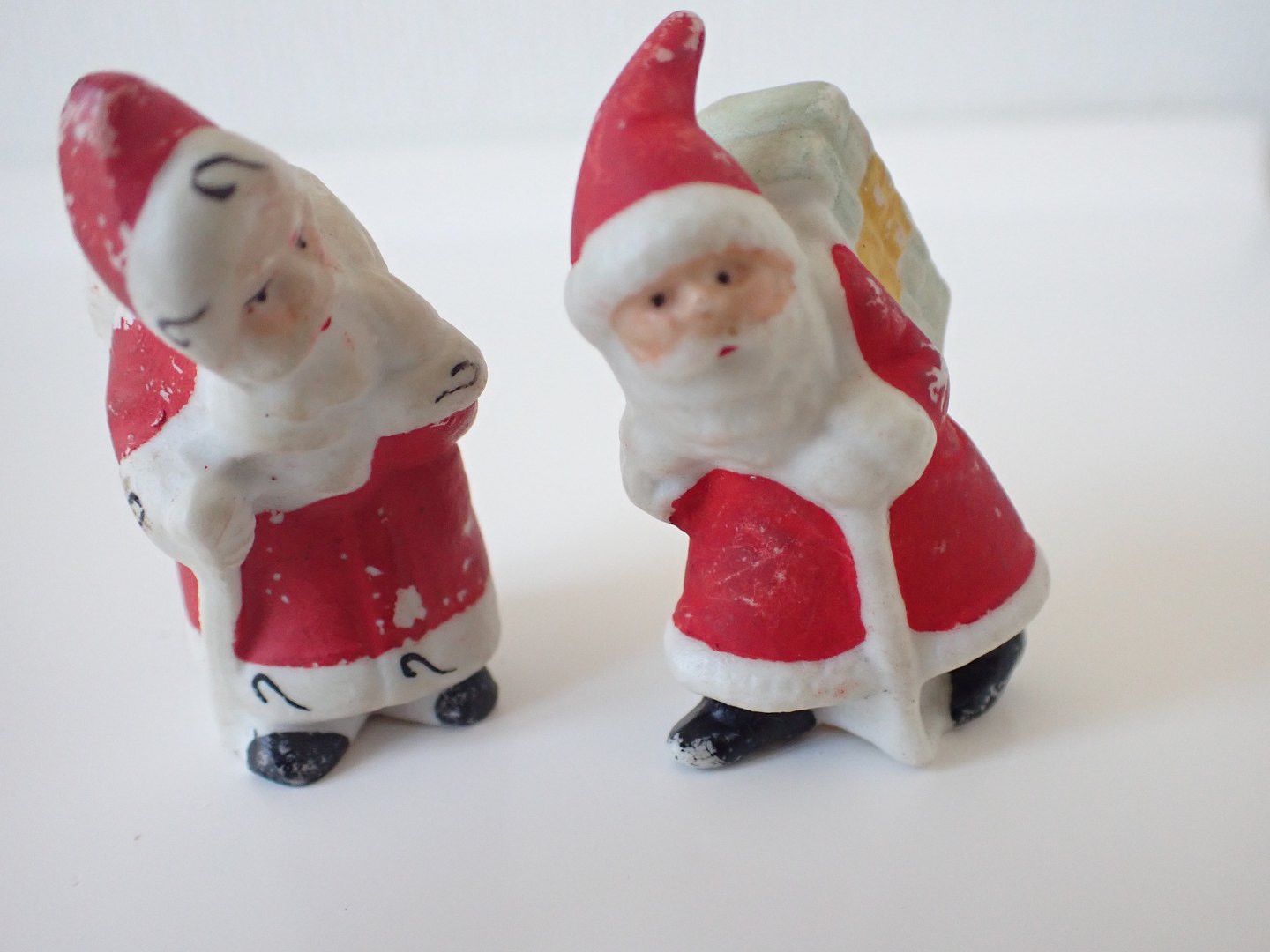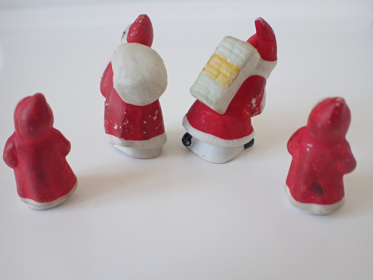 Text available in Danish: 4 håndmalede tyske biscuit julemænd 2 med gavesække på ryggen og 2 uden.. Ca. 1930. Højde: 2 stk. på 3,8 til 250 kr. pr. stk. og 2 stk. 5 cm. til 300 kr. pr. stk. I pæn tidstypisk stand.