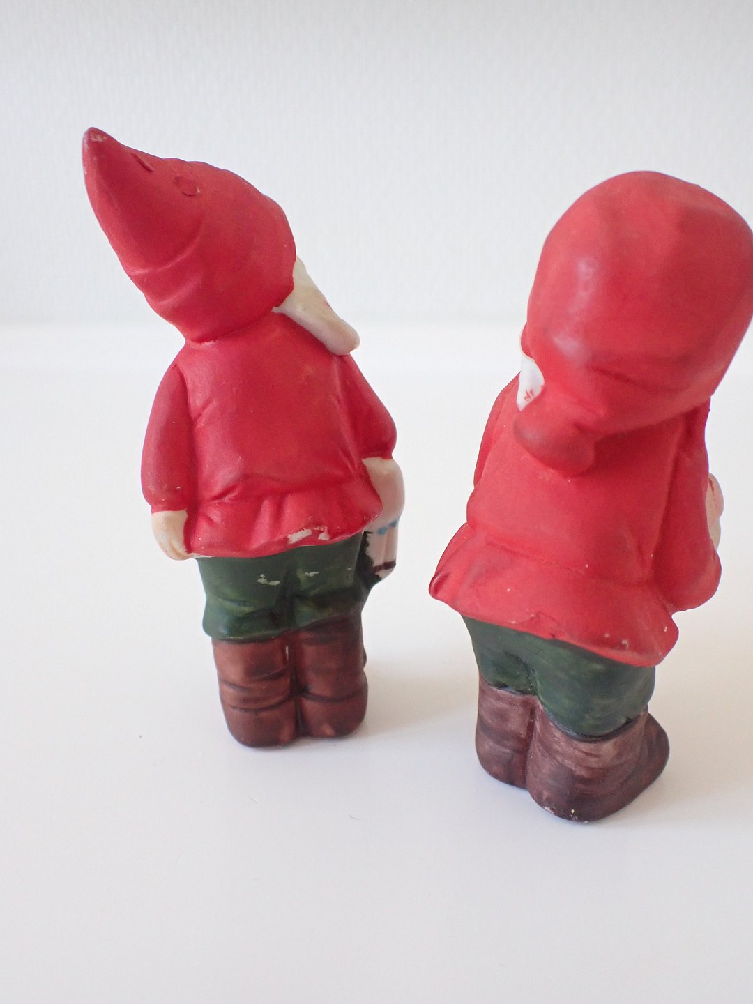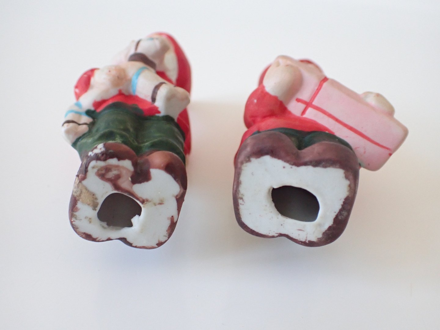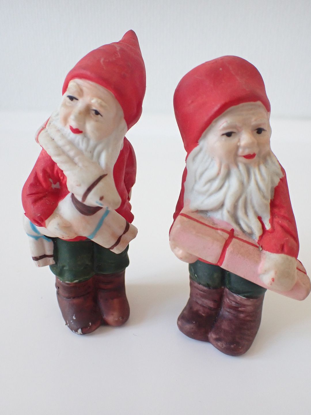 Text available in Danish: 2 håndmalede biscuitnisser, formentlig tyske. En holder en julebuk og en holder en pakke. Fra 1950-erne. Højde: 8 - 9 cm. I fin stand. Sælges individuelt for 275 kr. pr. stk.