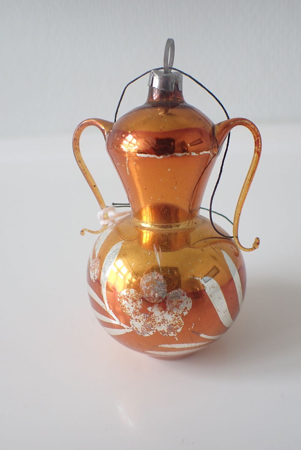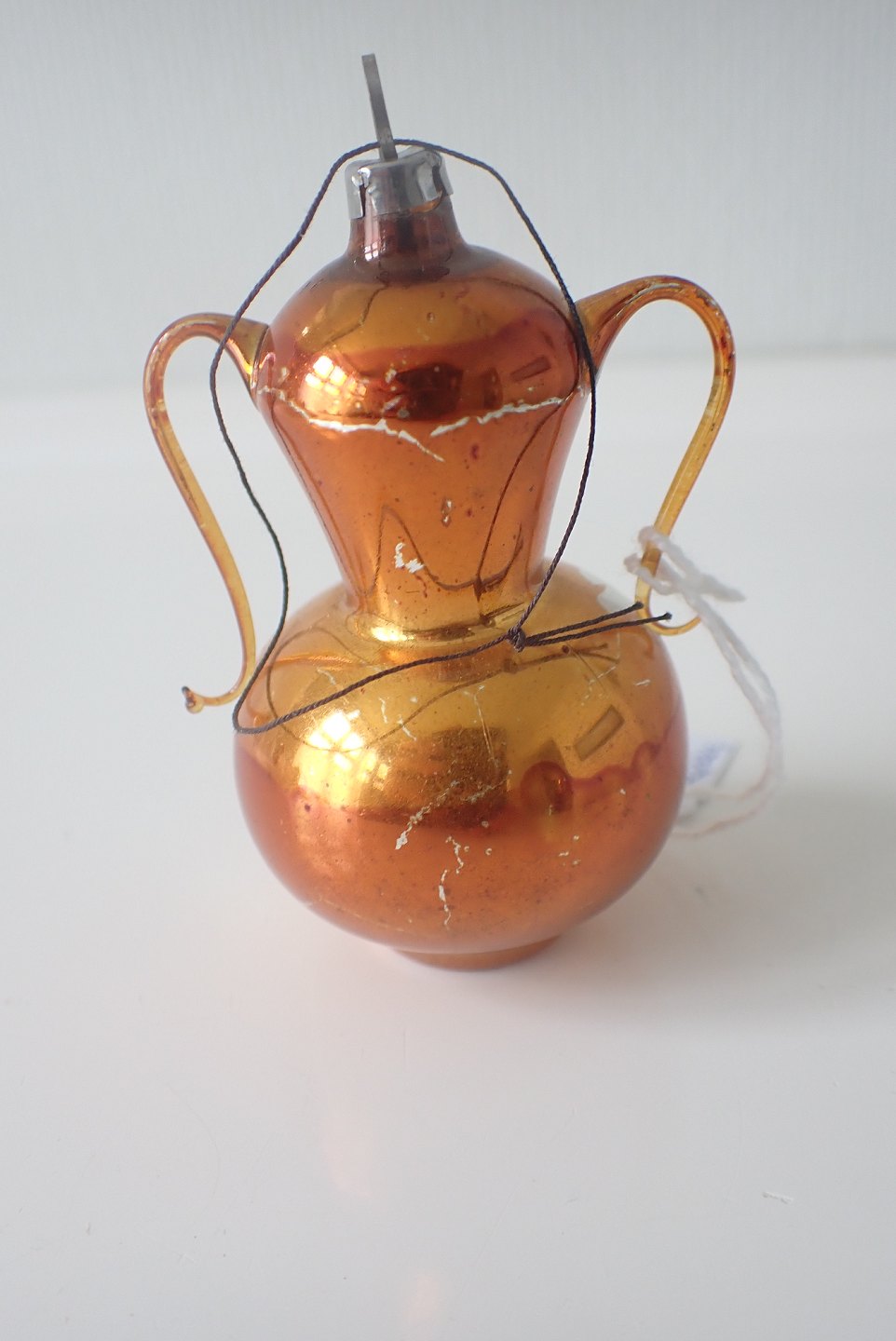 Text available in Danish: 1 stk. tidlig glasjulepynt i form af en vase fra Leipsig.