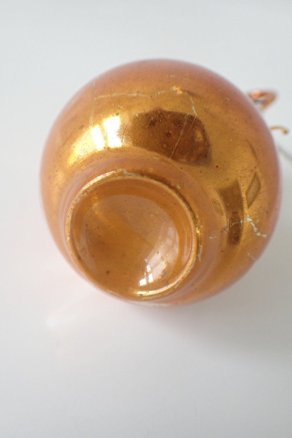 Text available in Danish: 1 Stk. glasjulepynt - 2 hanket lågvase i guldbronze med sølvdekoration. Med ophæng og kan stå. Stammer fra Leipzig tidlig 1900-tal. Højde: 7,2 cm. Bredeste diameter: 4,3 cm. I fin stand.
