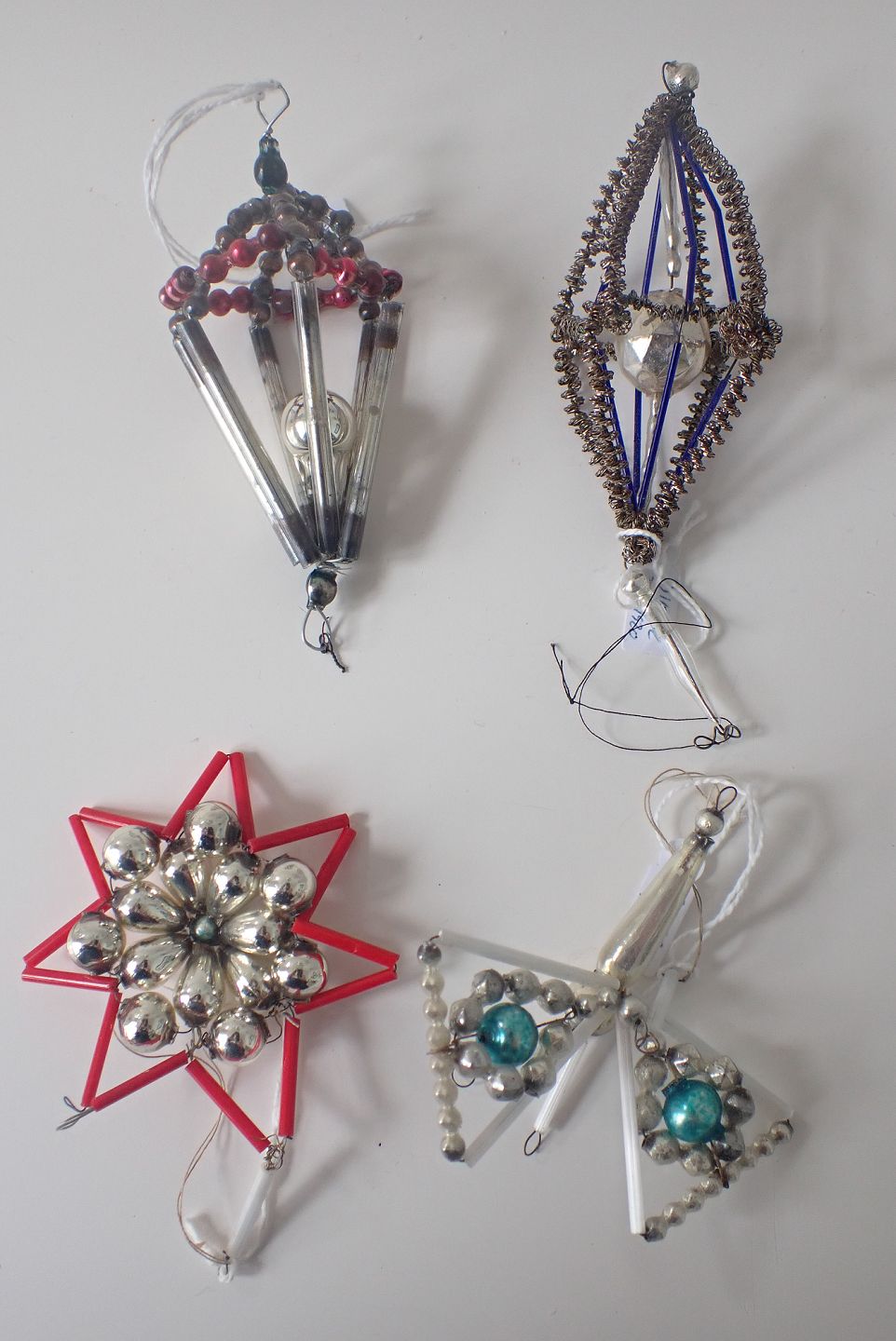 Text available in Danish: 4 stk. sammensatte glasjulepynt fra Tyskland.