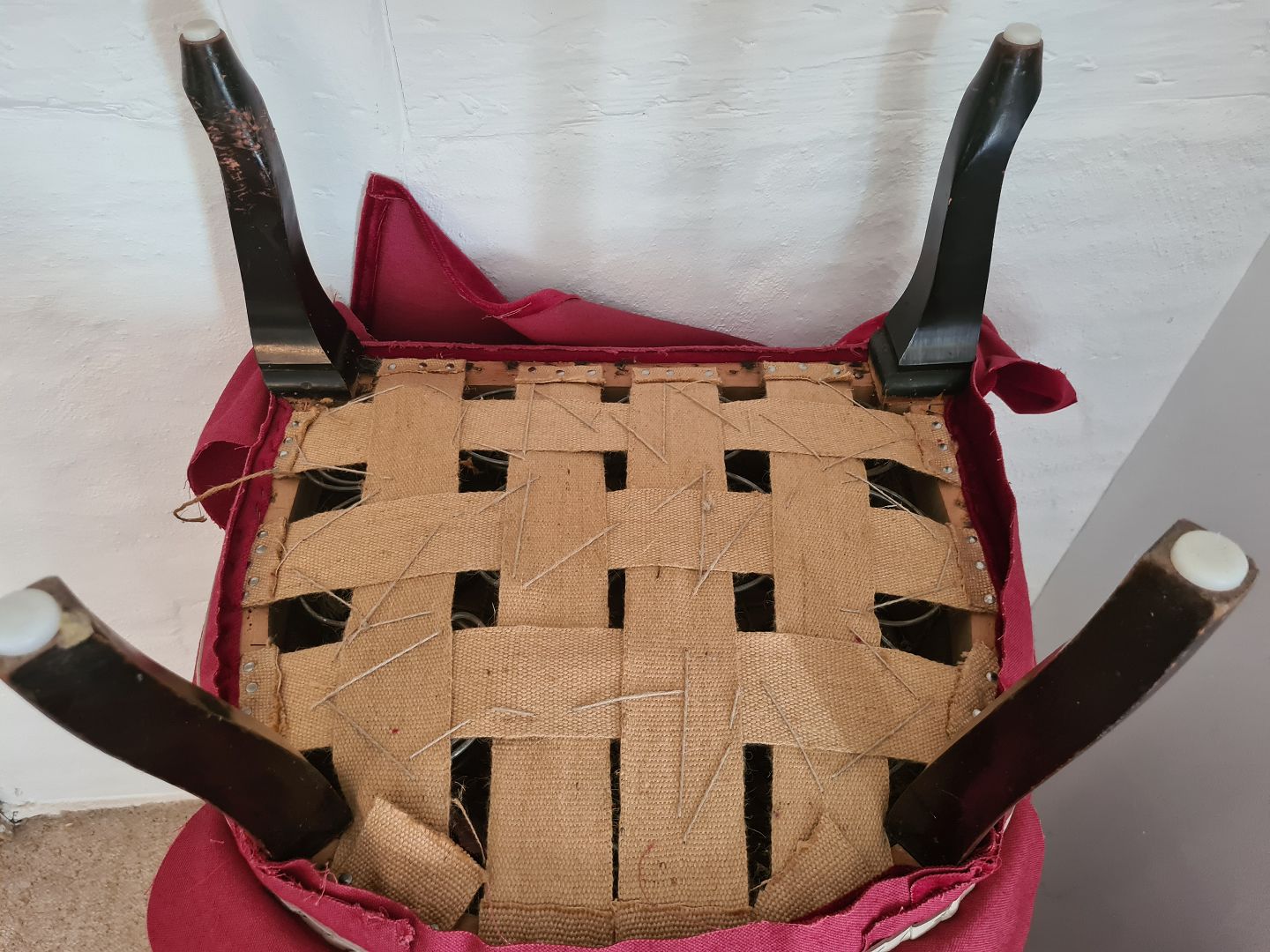 Par lænestole fra 1950'erne overbetrukket med rødt velour. Fremstår pæne og velholdte uden nævneværdige brugsspor.