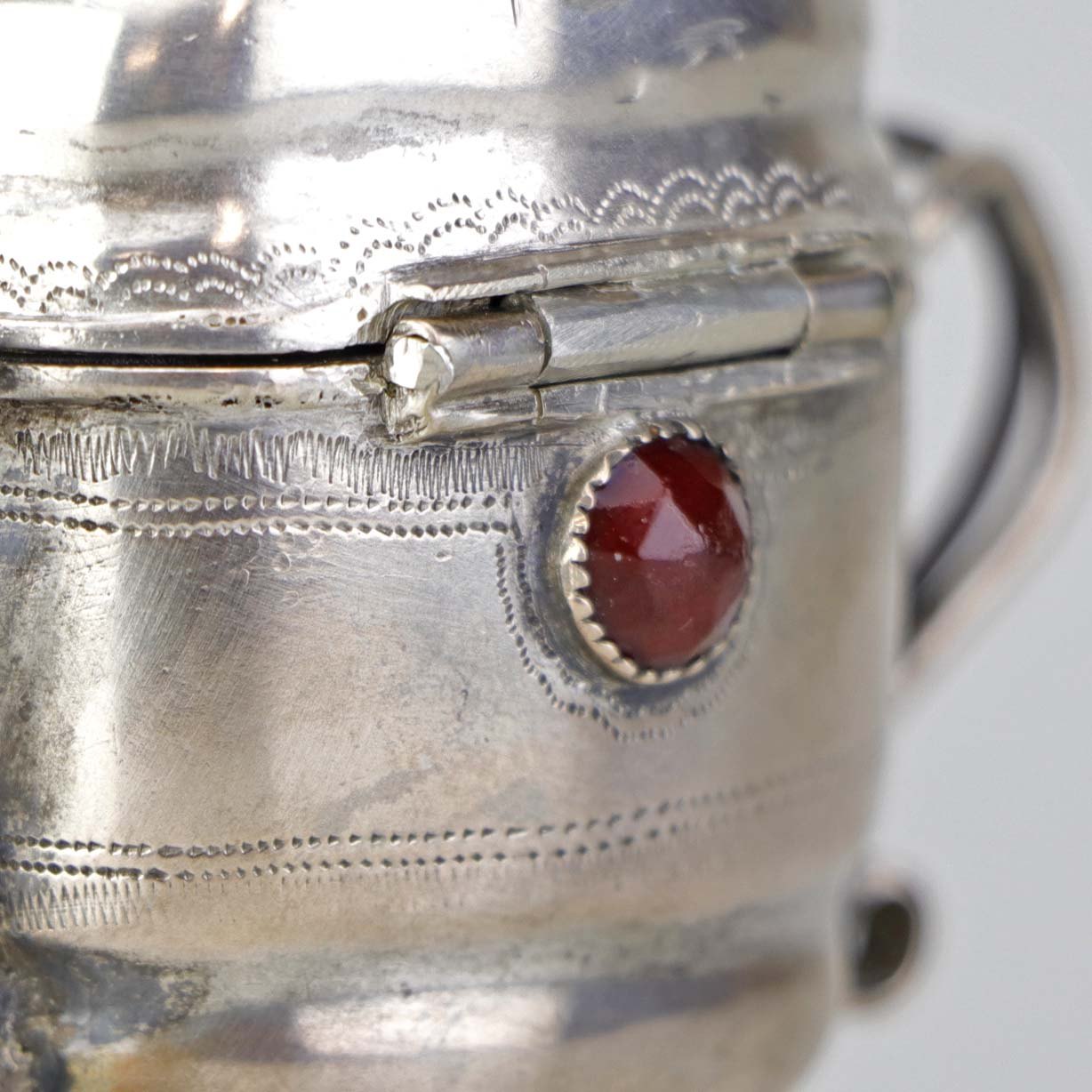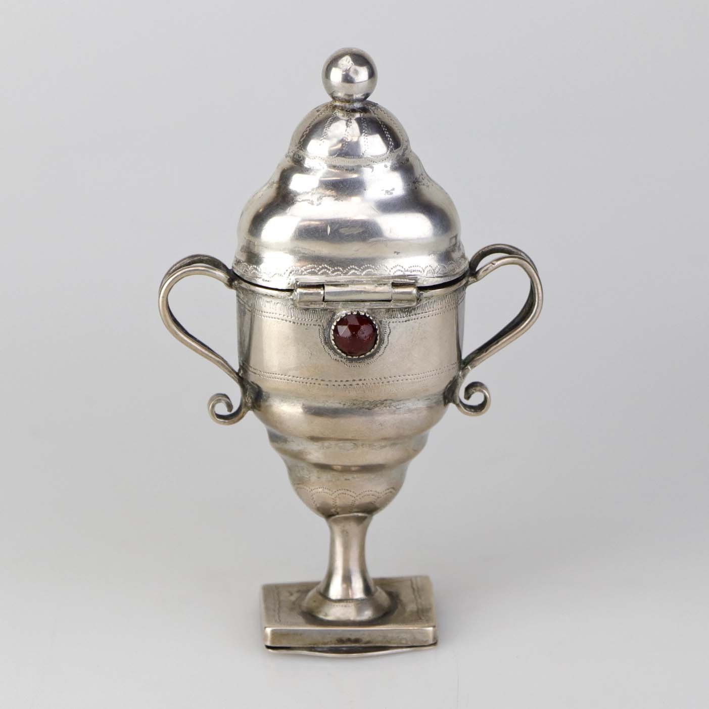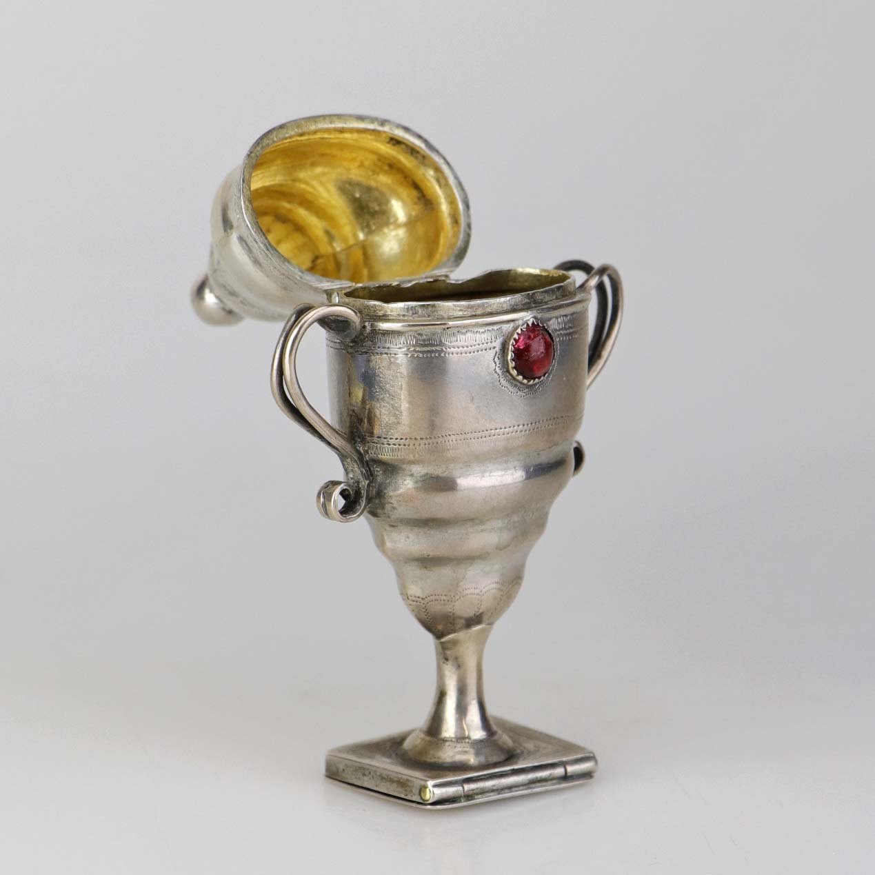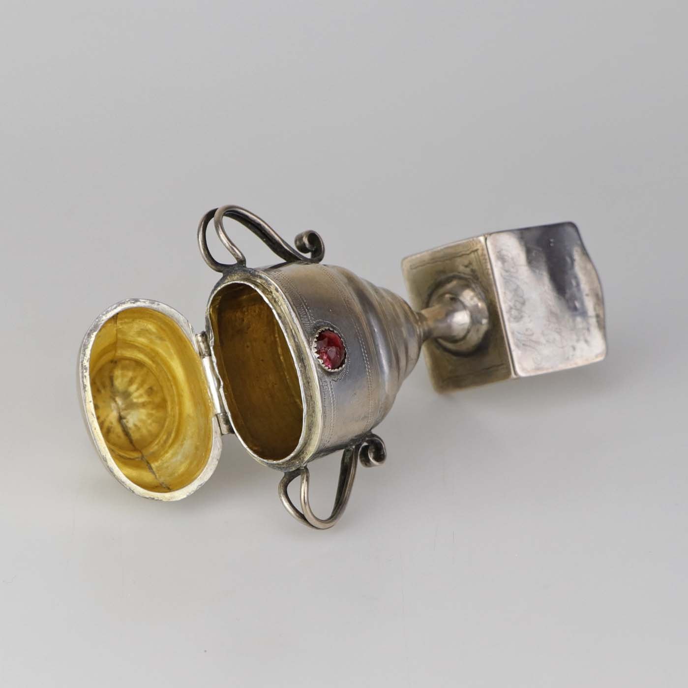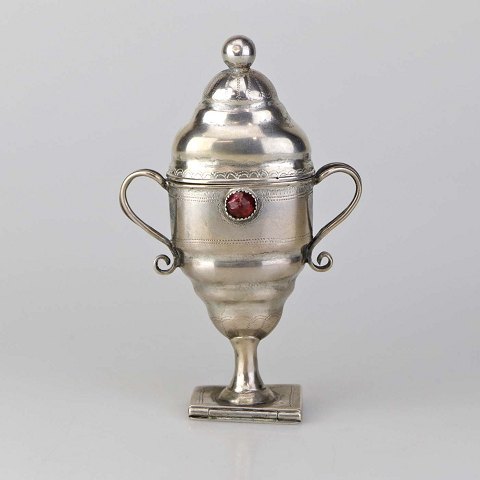 Text available in Danish: Hovedvandsæg i sølv pyntet med to røde sten og med ekstra rum under foden. Indgraveret monogram under bunden M KMD, Estrup 1831
