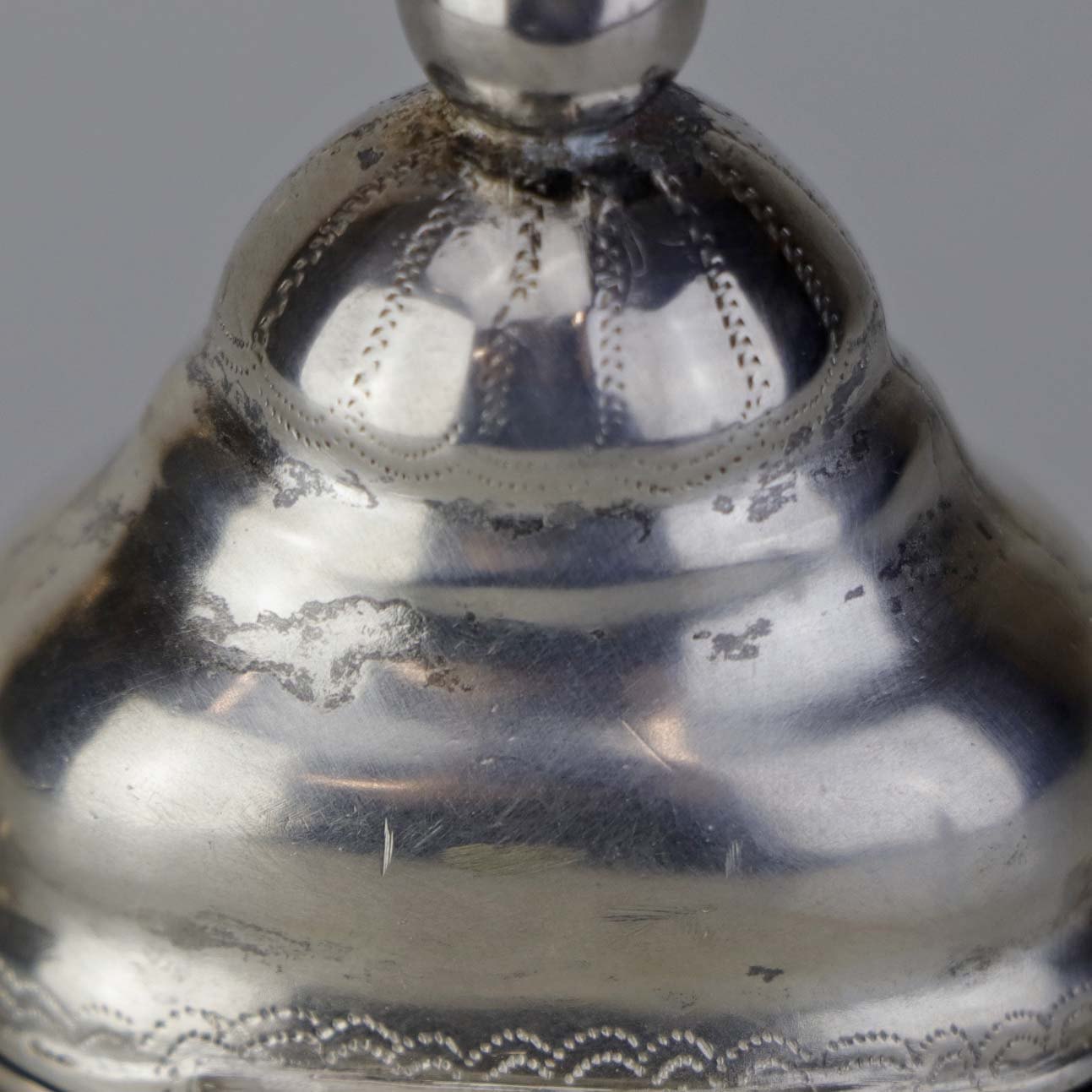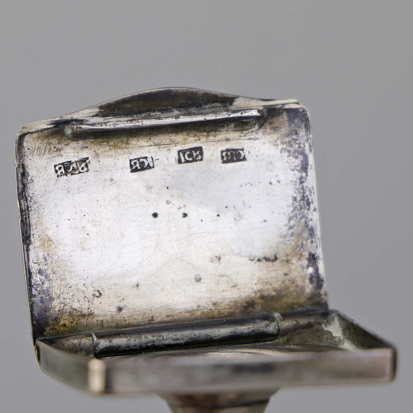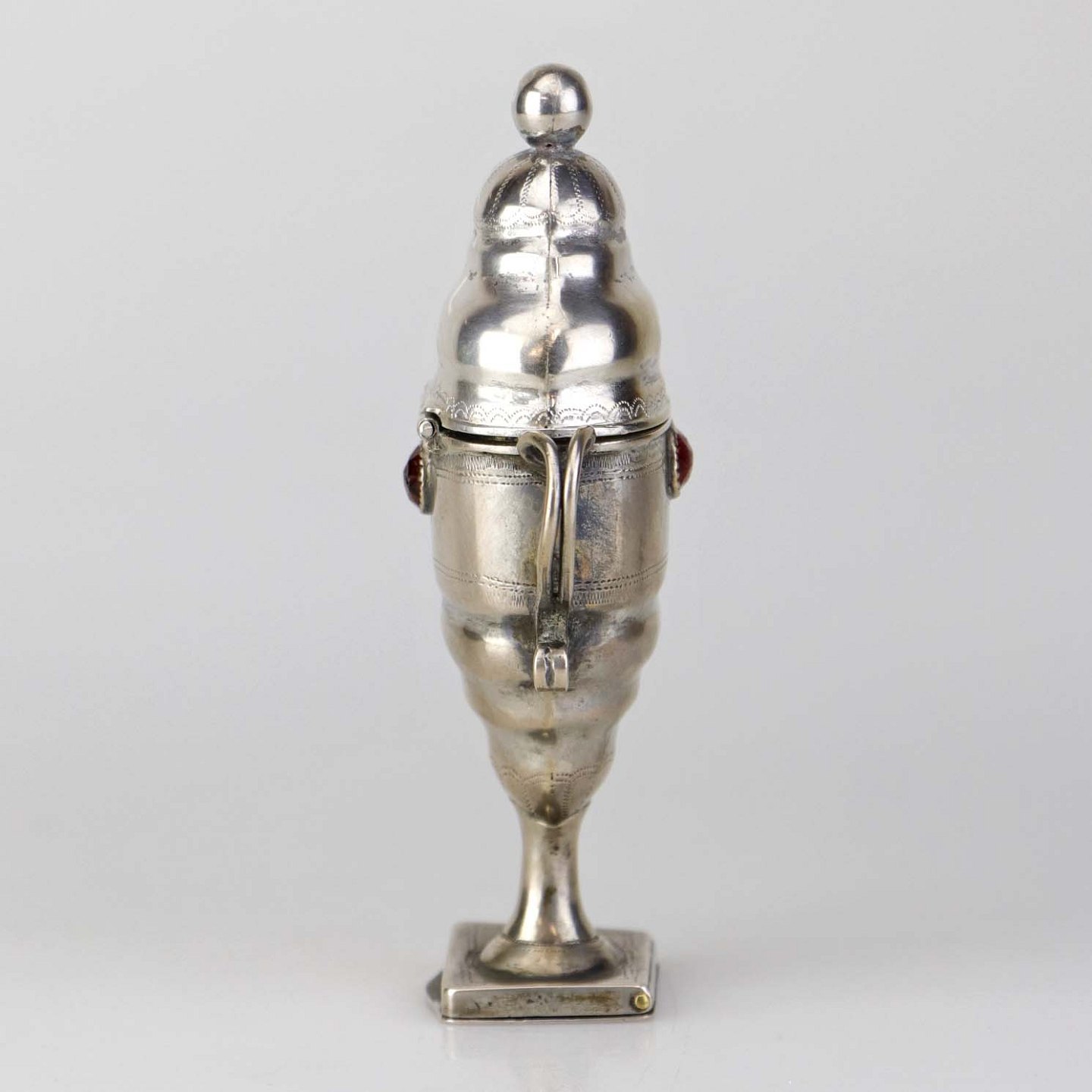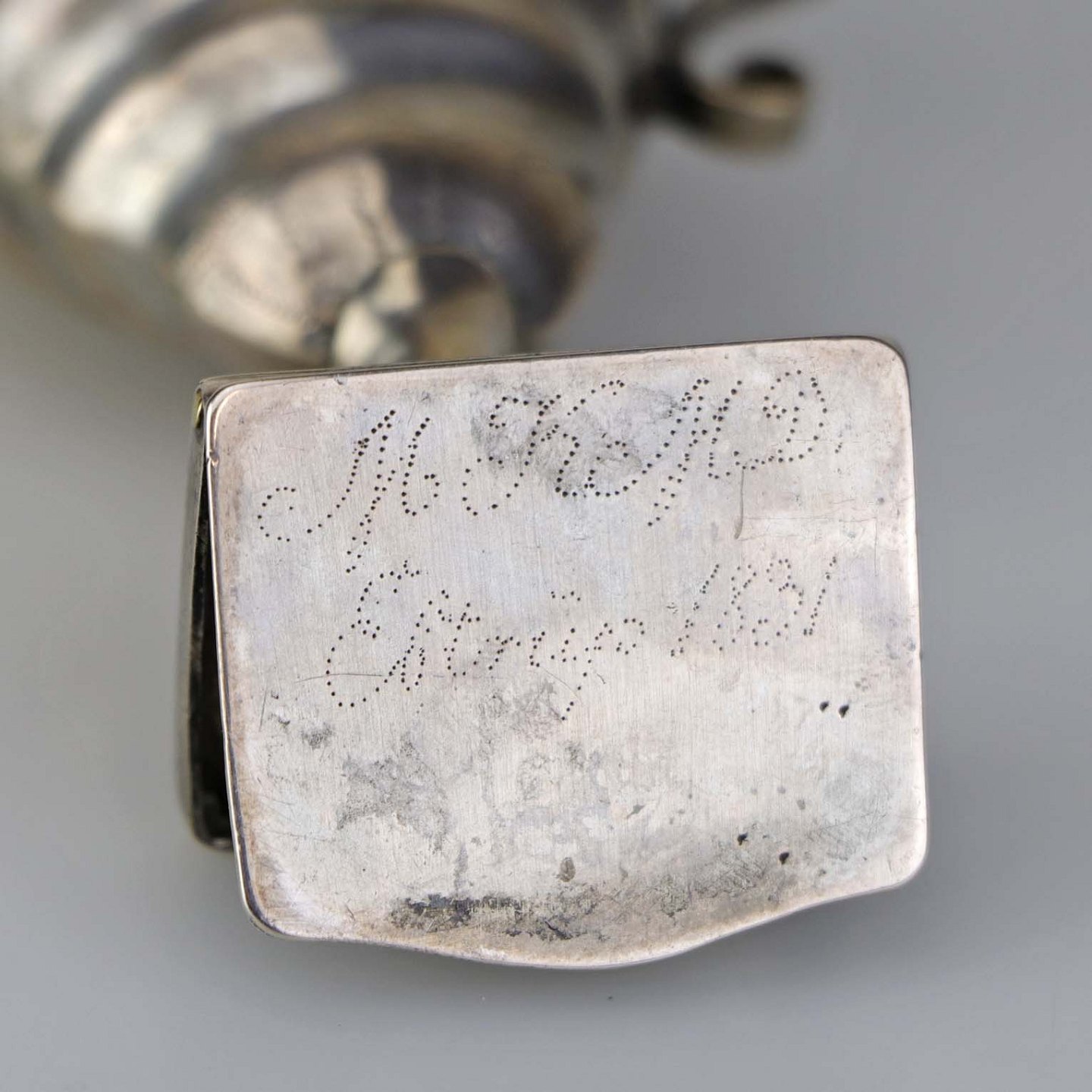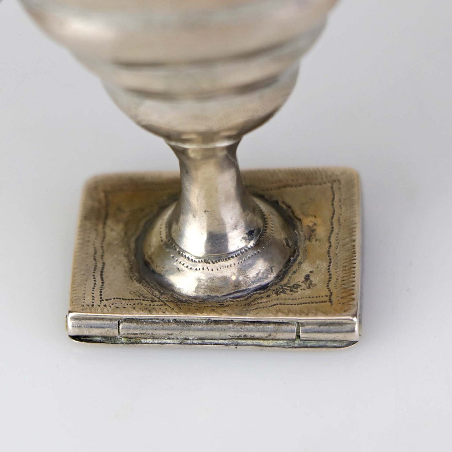 Text available in Danish: Hovedvandsæg i sølv pyntet med to røde sten og med ekstra rum under foden. Indgraveret monogram under bunden M KMD, Estrup 1831