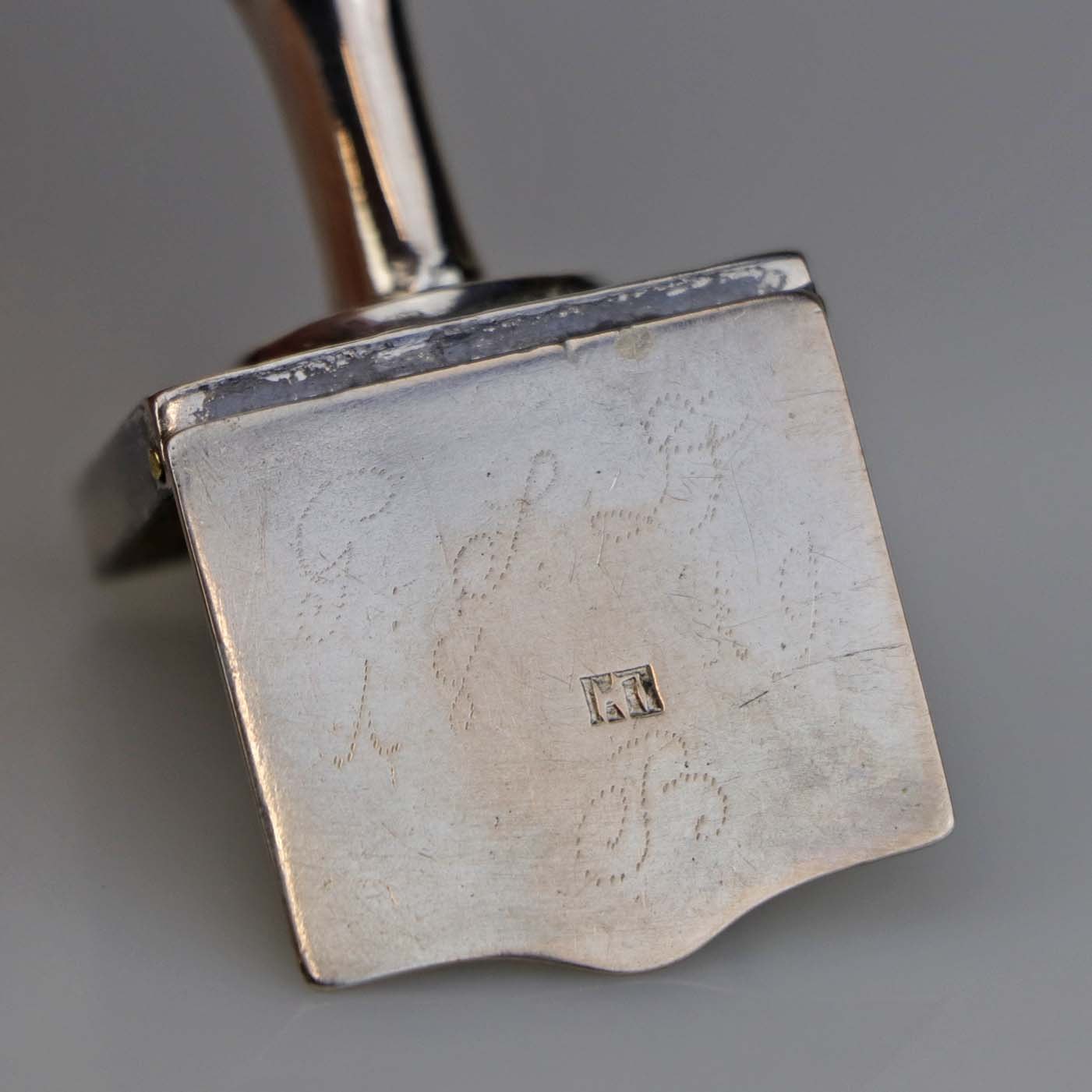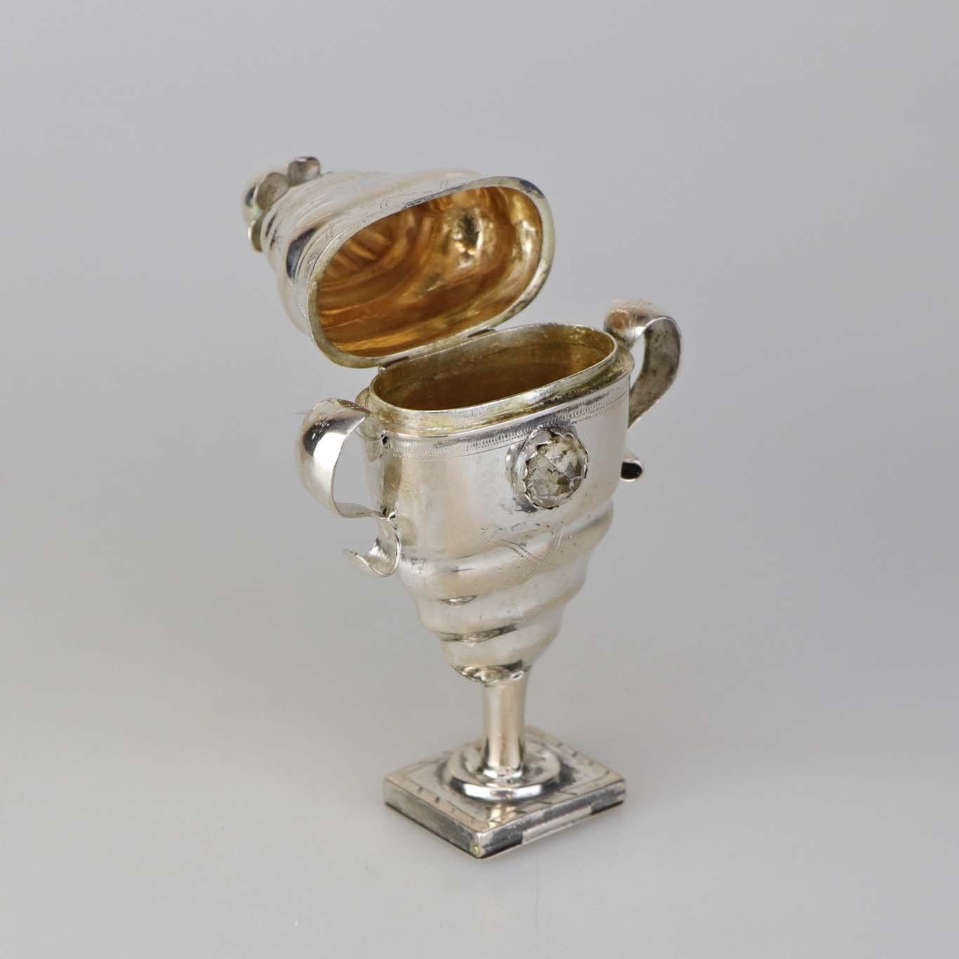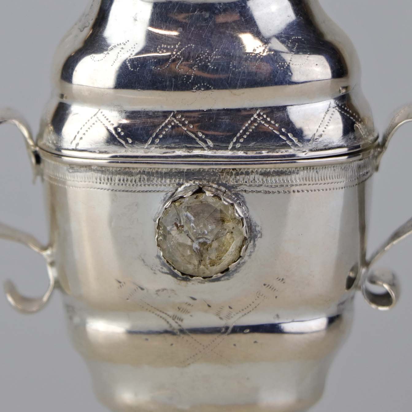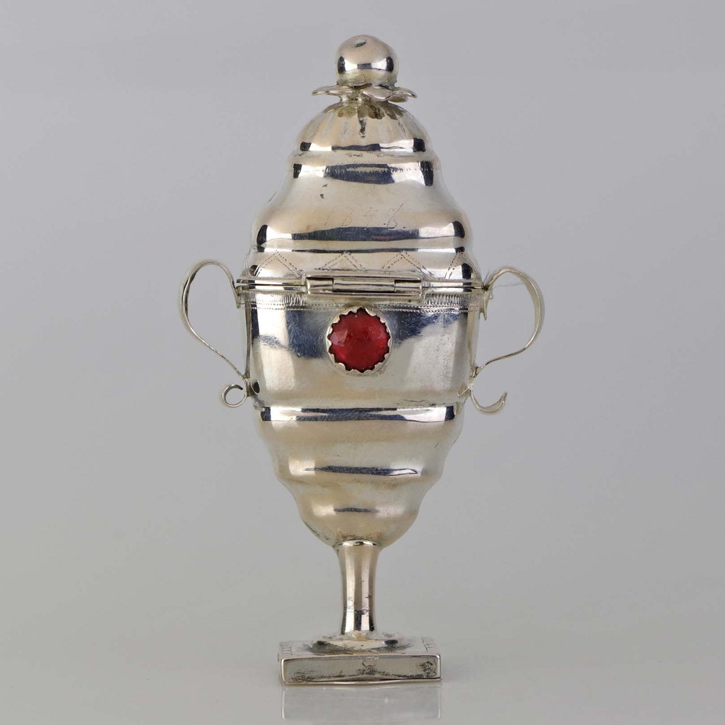 Text available in Danish: Hovedvandsæg i sølv med pynt af en hvid og en rød sten samt ekstra rum under foden. Fremstår med monogrammer og årstal 1819 samt år 1848