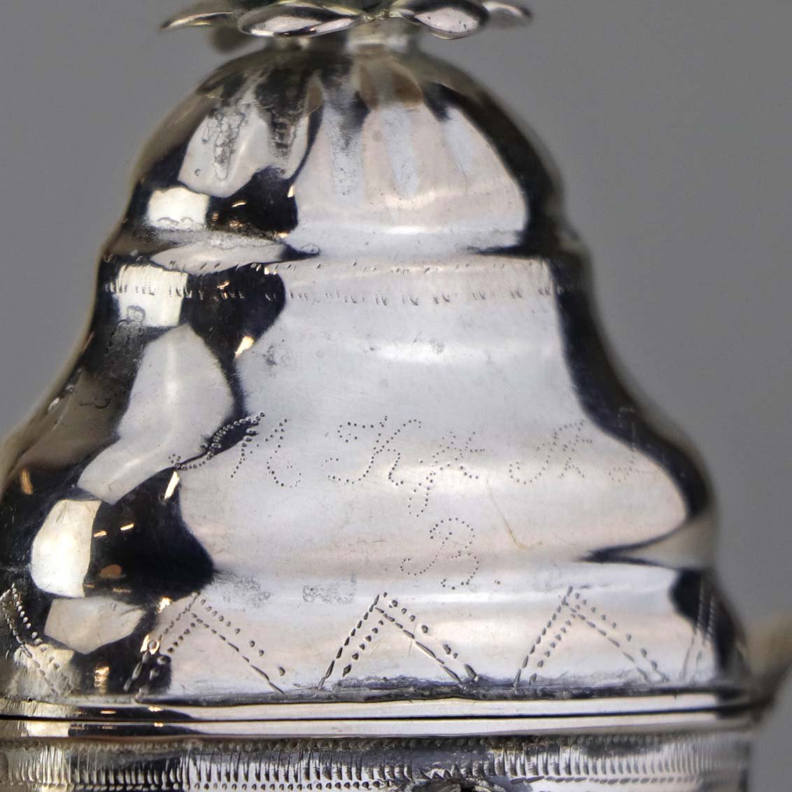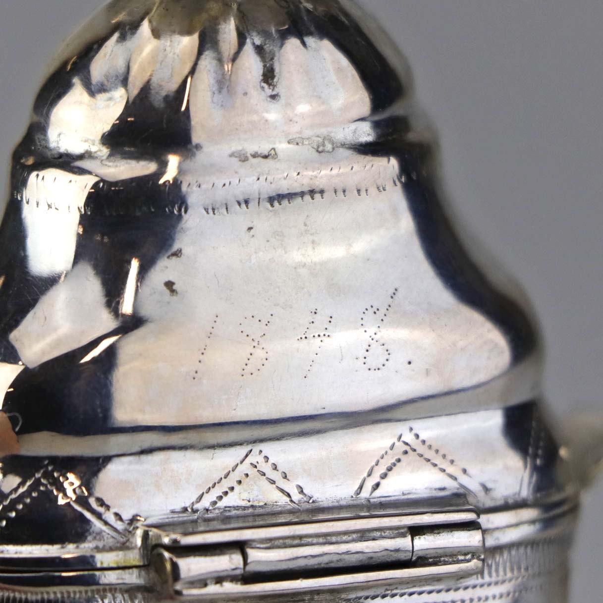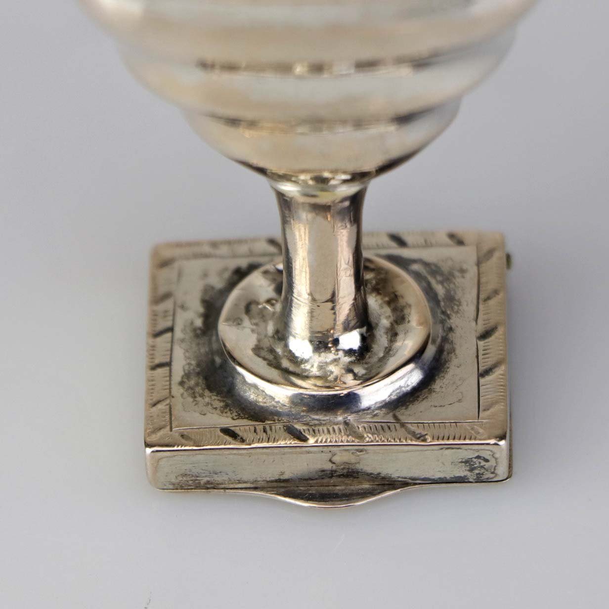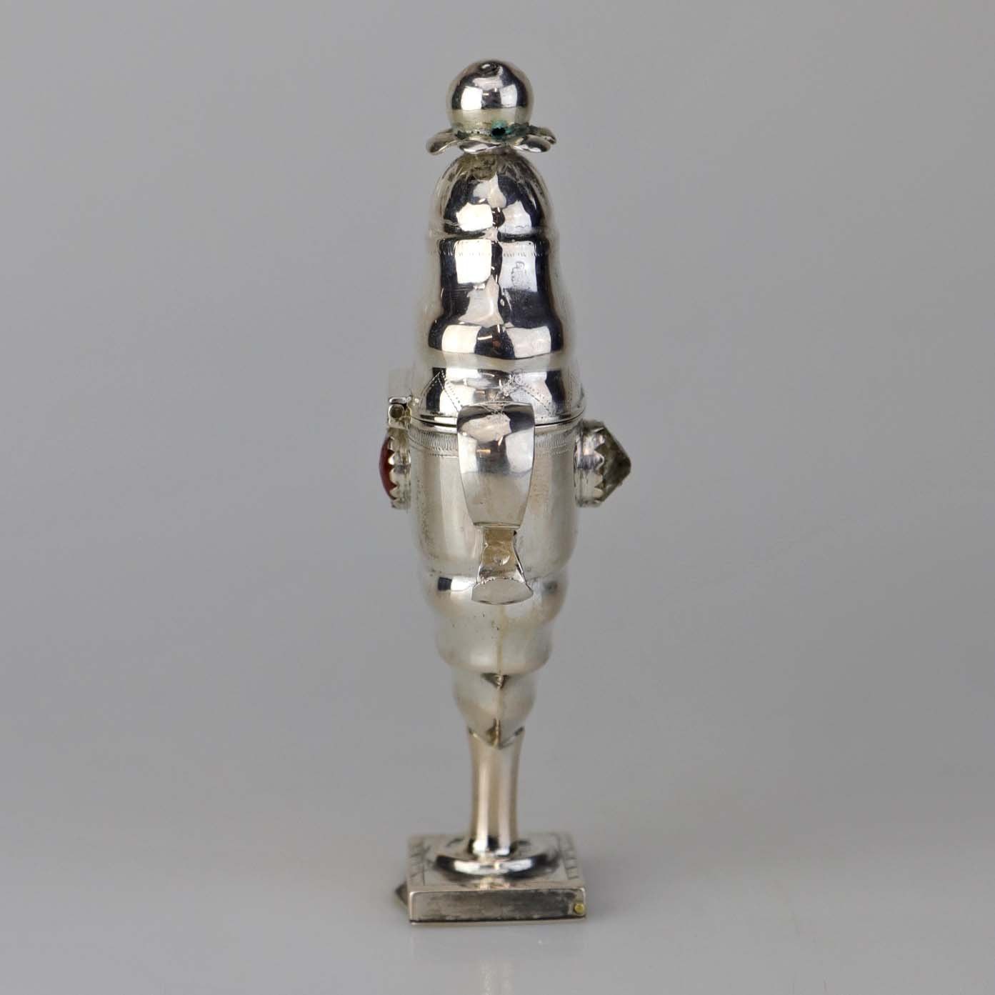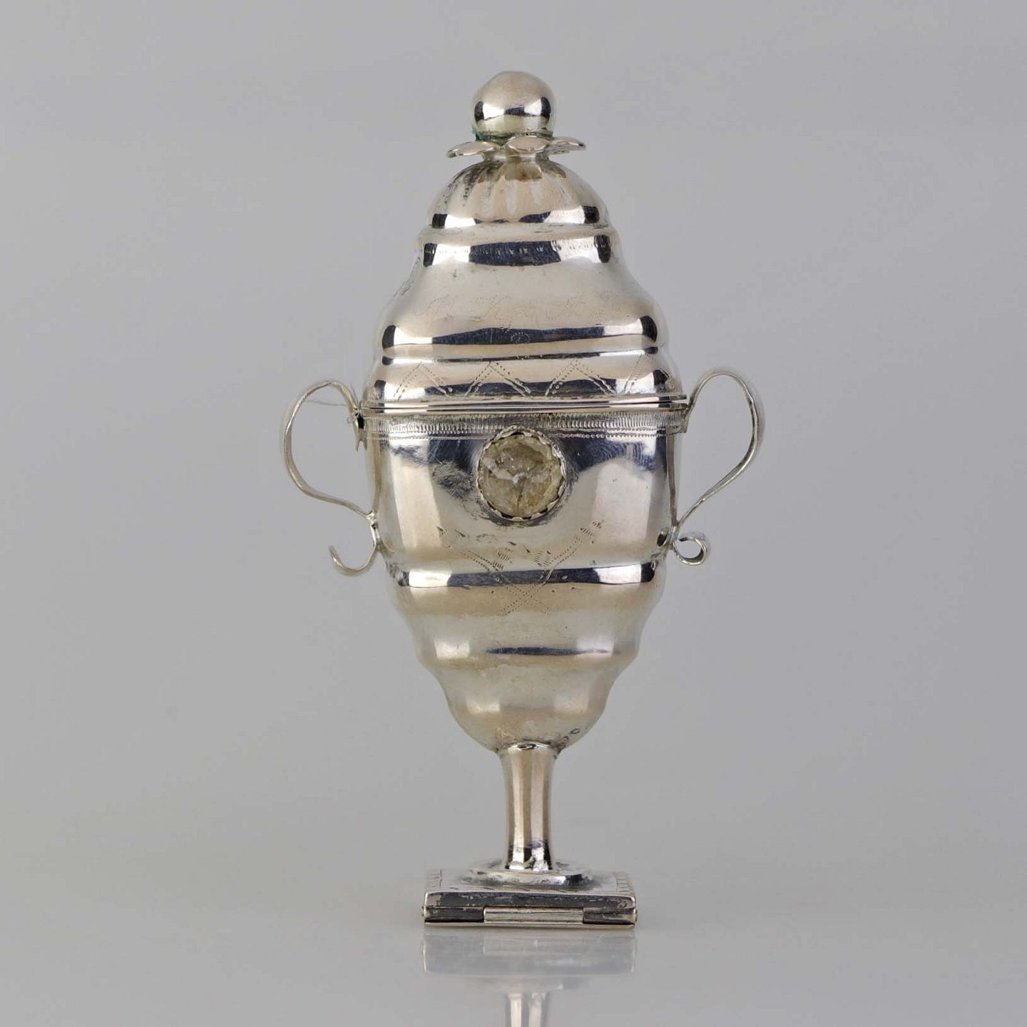 Text available in Danish: Hovedvandsæg i sølv med pynt af en hvid og en rød sten samt ekstra rum under foden. Fremstår med monogrammer og årstal 1819 samt år 1848