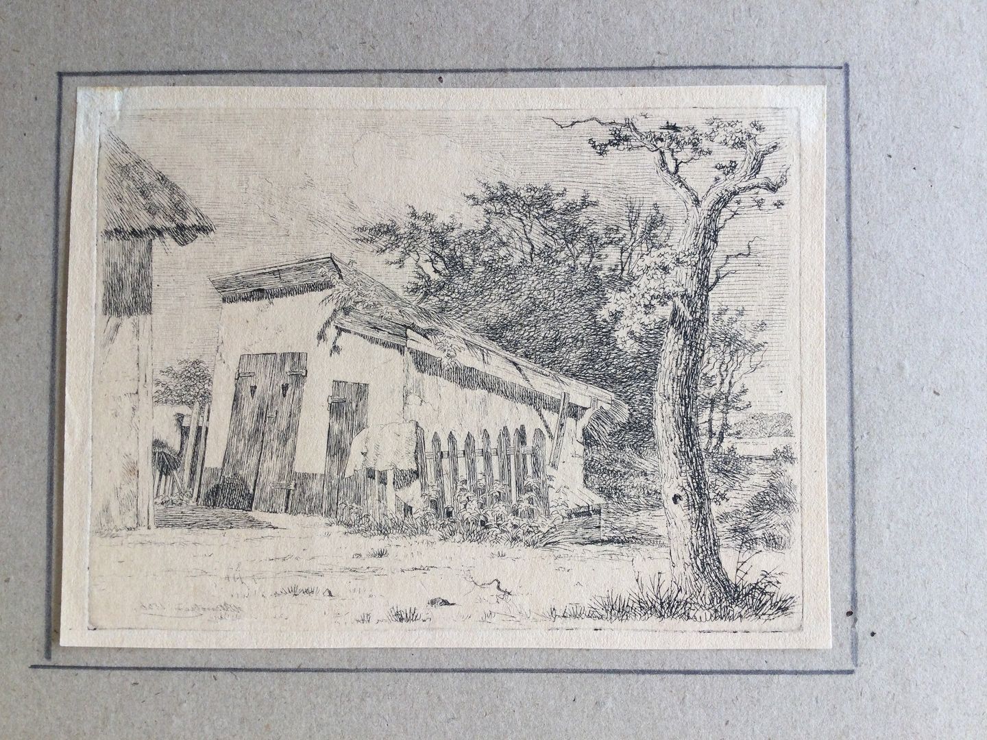 Radering på papir monteret på pap.