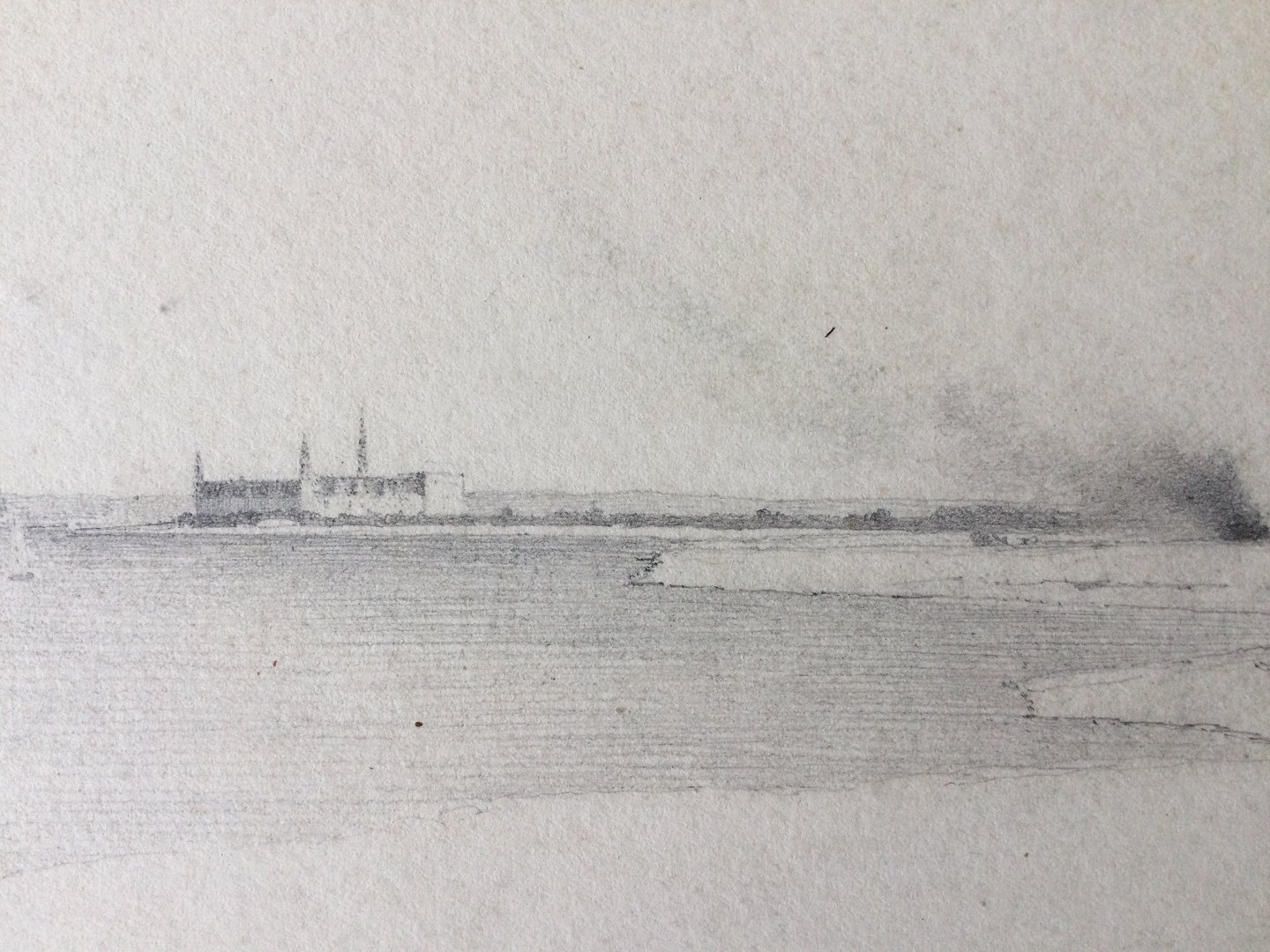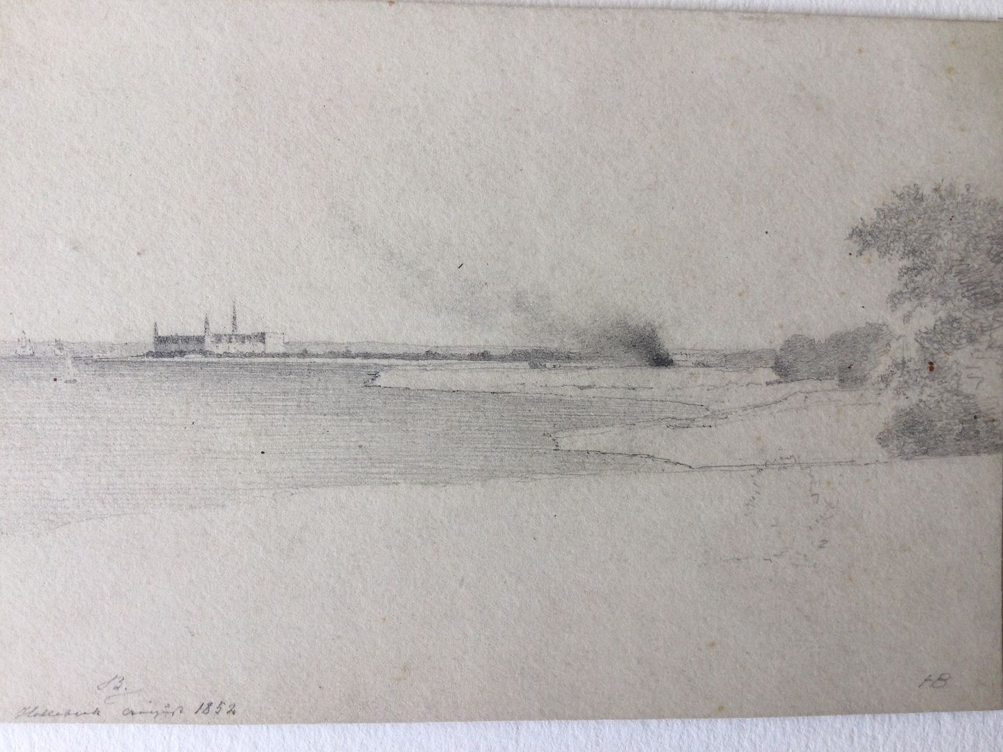 Text available in Danish: Tegning af Heinrich Buntzen - Udsigt fra Hellebæk mod Kronborg 1852.