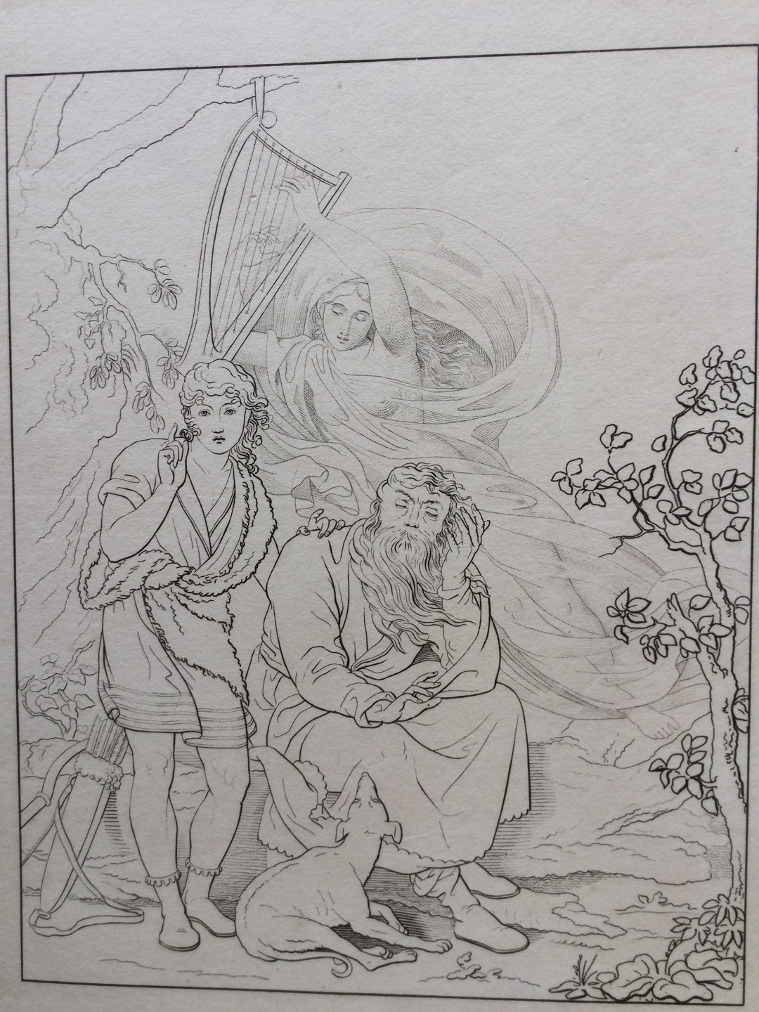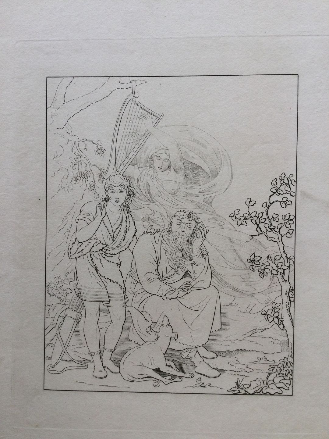 Text available in Danish: Radering efter C.G. Kratzenstein-Stubs "Ossian og Alpins Søn hører Malvinas Ånd gribe i Harpens Strenge" fra 1815.