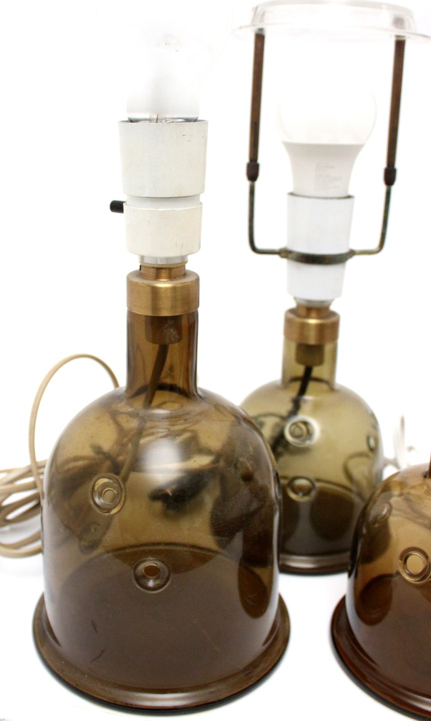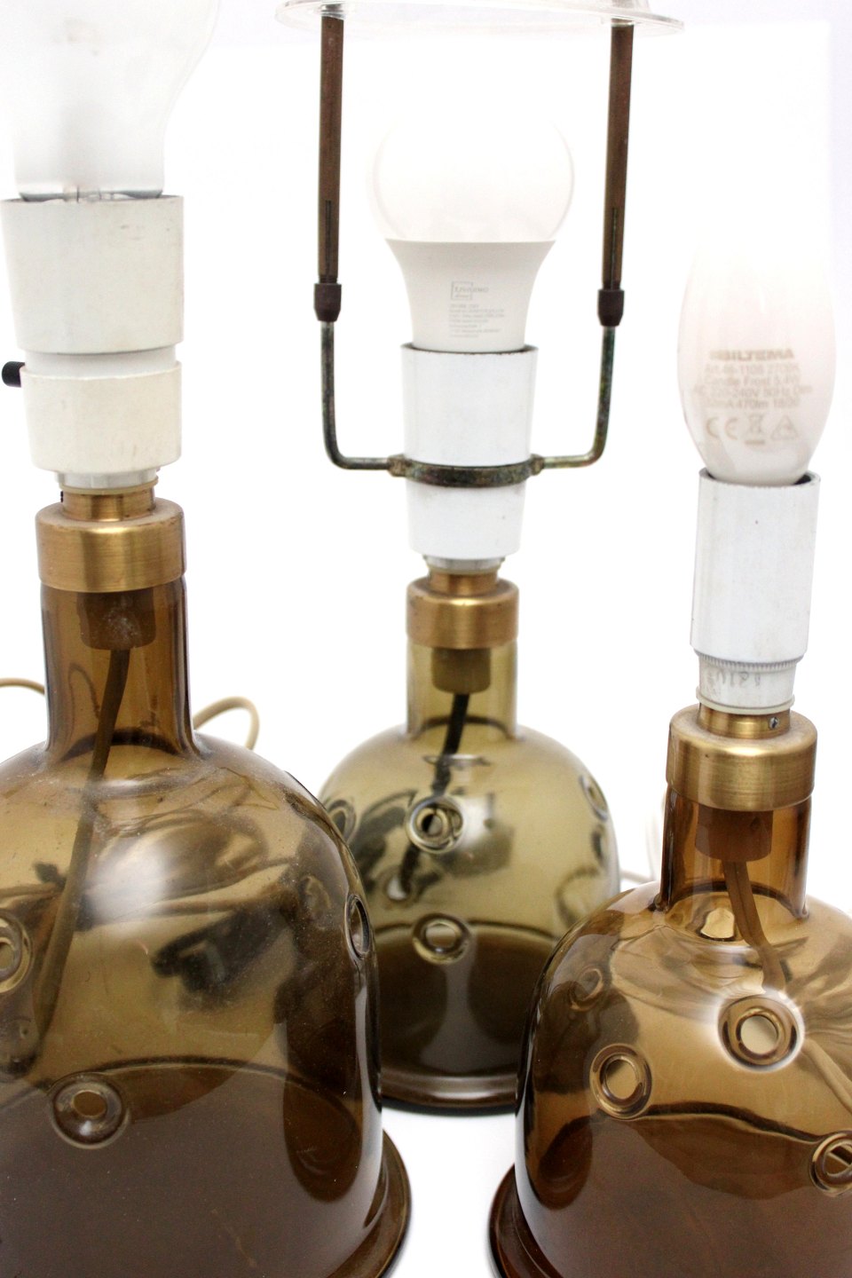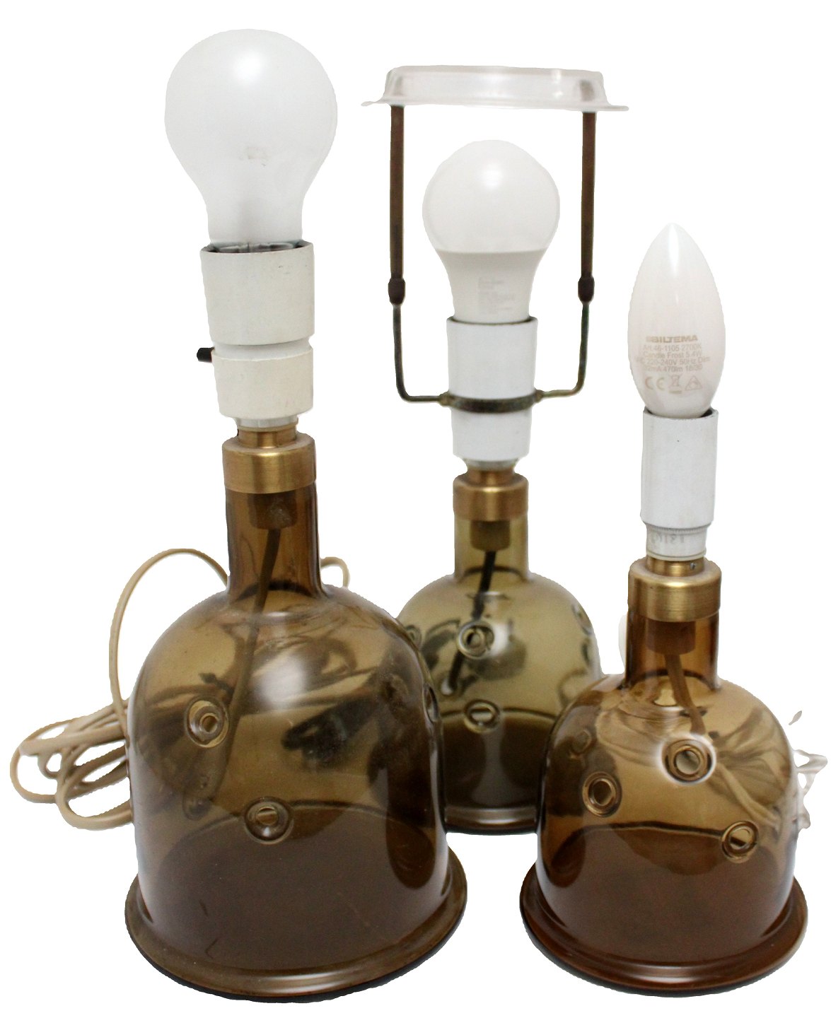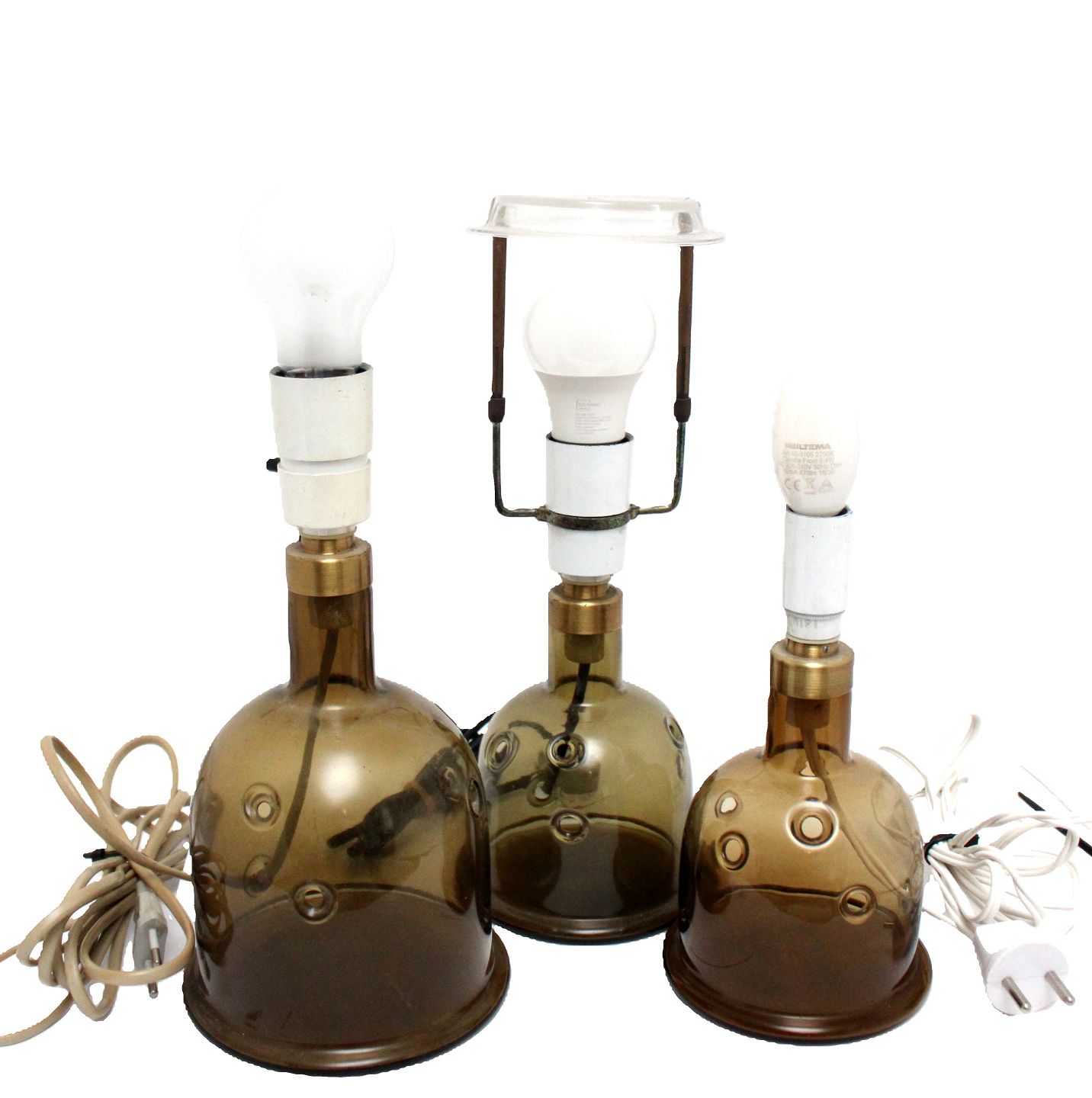 Text available in Danish: Holmegaard produceret på Fyens glasværk, Meteor bordlamper, model D, Havanna brunlig transparent glas med 5 huller. Designet af Michael Bang i 1974, udgået af produktion 1981.