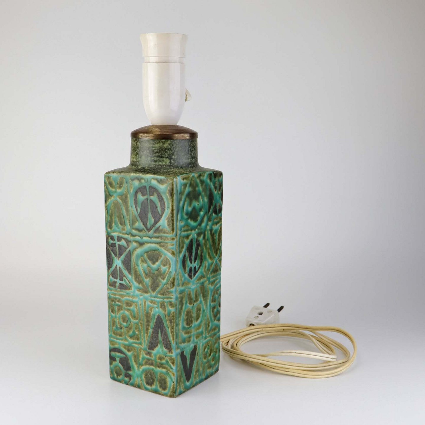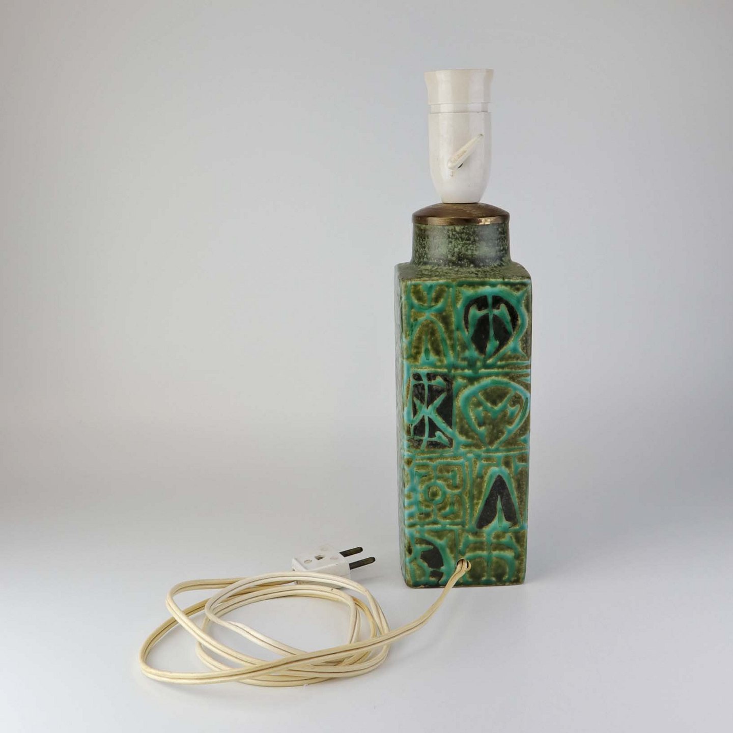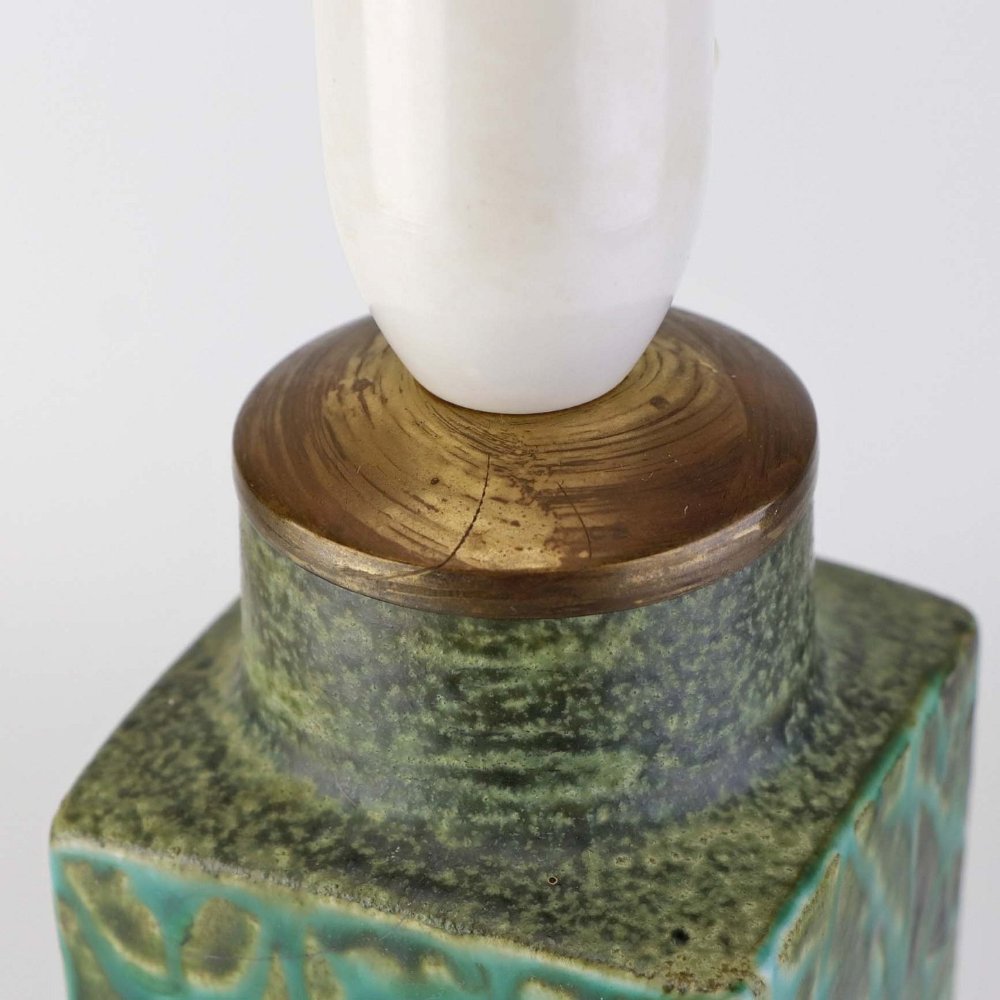 Text available in Danish: Lampefod i grøn fajance med topplade i rustik messing. Lampen er fra Baca serien og dekoreret med abstrakt mønster. Nr. 712/3259