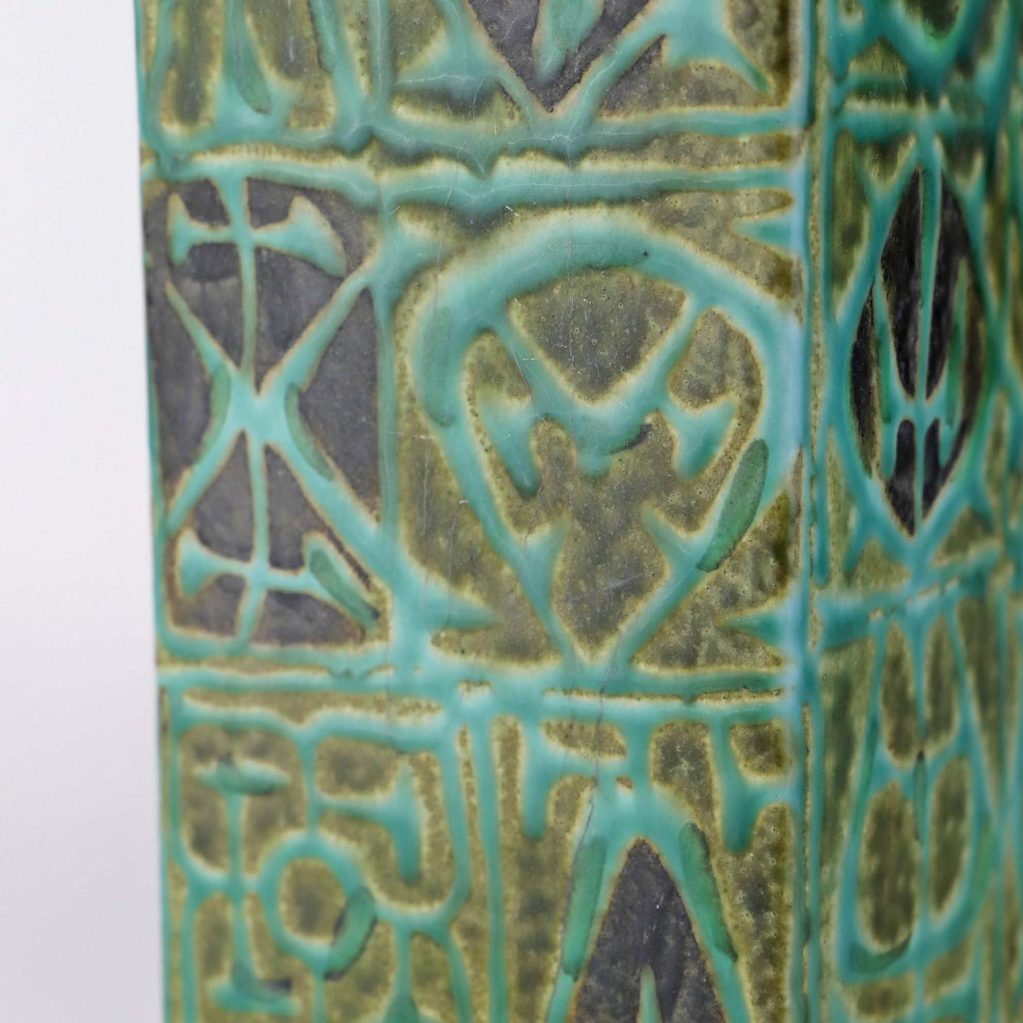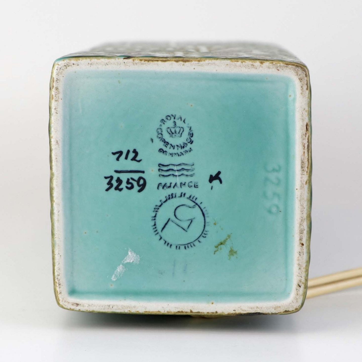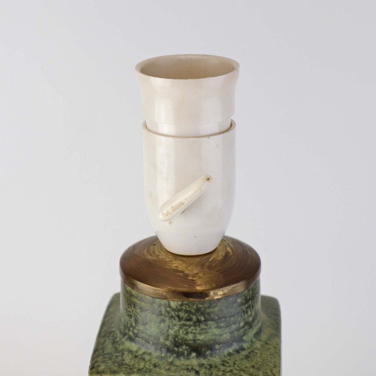 Text available in Danish: Lampefod i grøn fajance med topplade i rustik messing. Lampen er fra Baca serien og dekoreret med abstrakt mønster. Nr. 712/3259