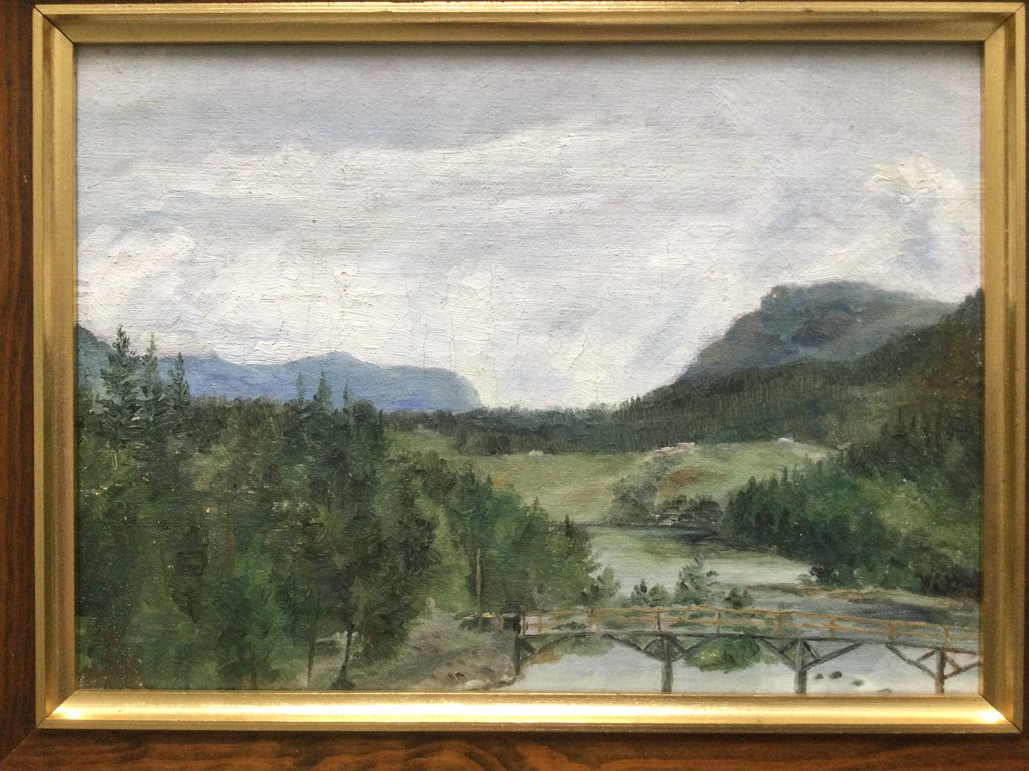 Maleri af Helene Irminger - Landskab med bjerge og bro.
