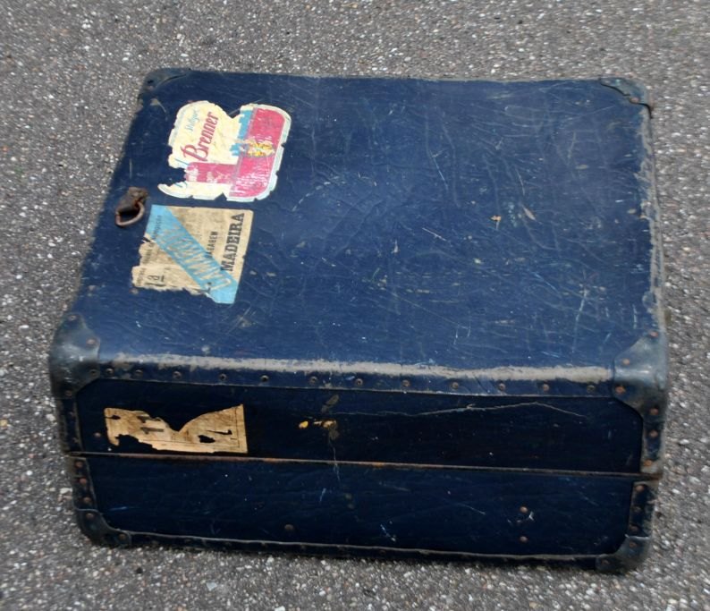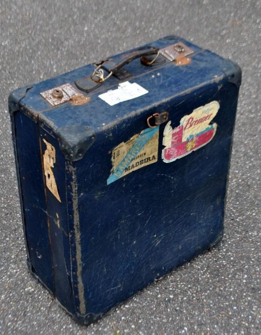 Suitcase, 20th century. With German labels. Wide handle. Two locks, rusty and without key. L: 54 cm. W: 49 cm. H: 26 cm.