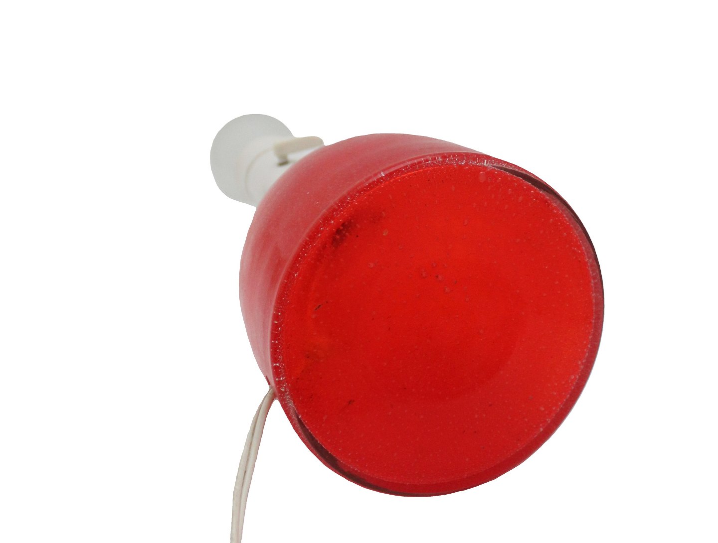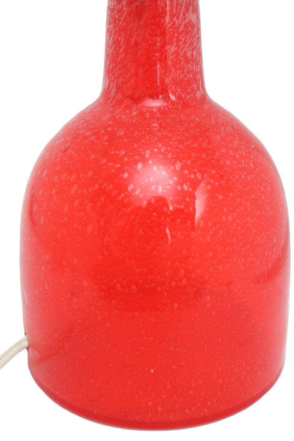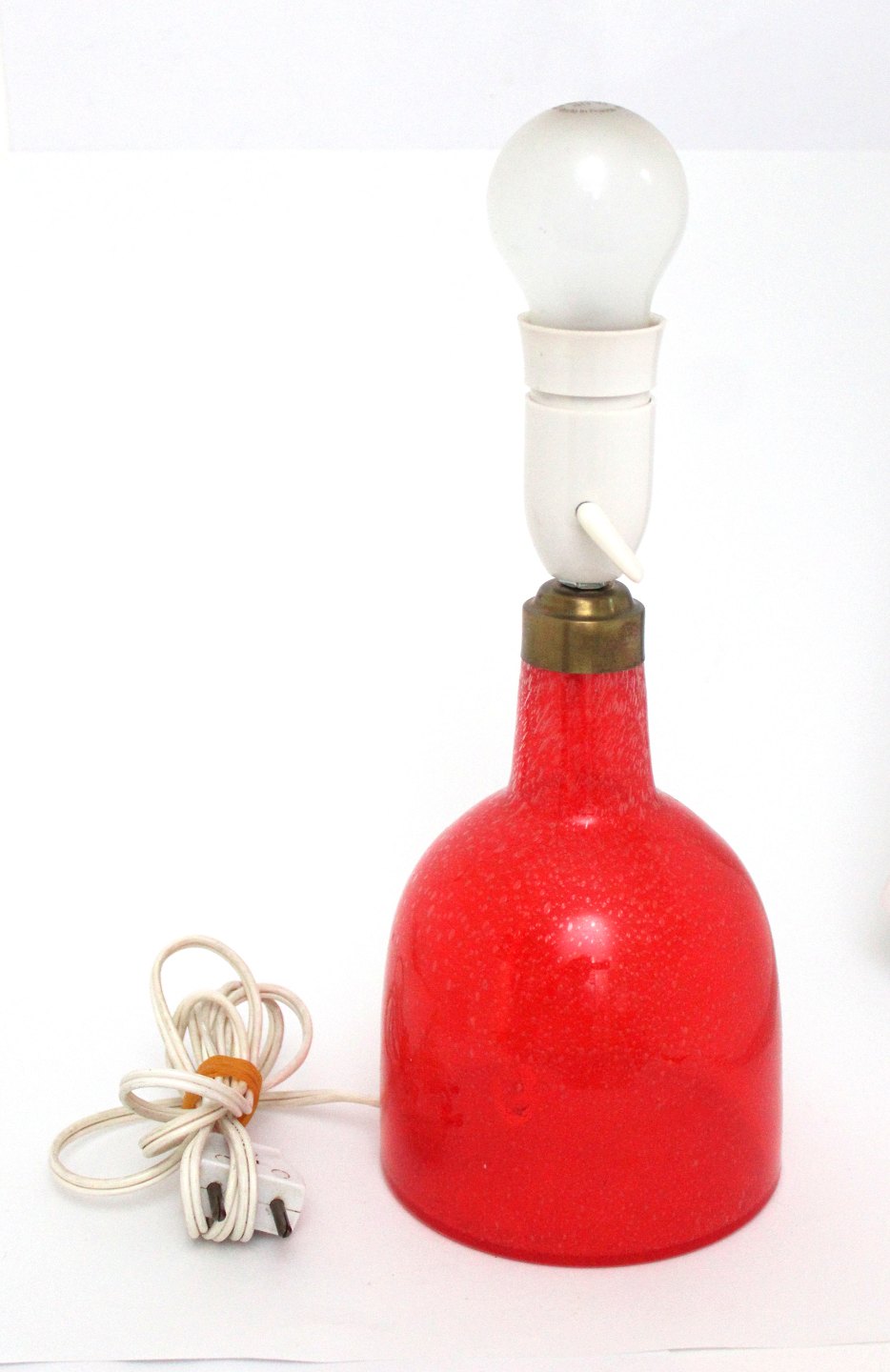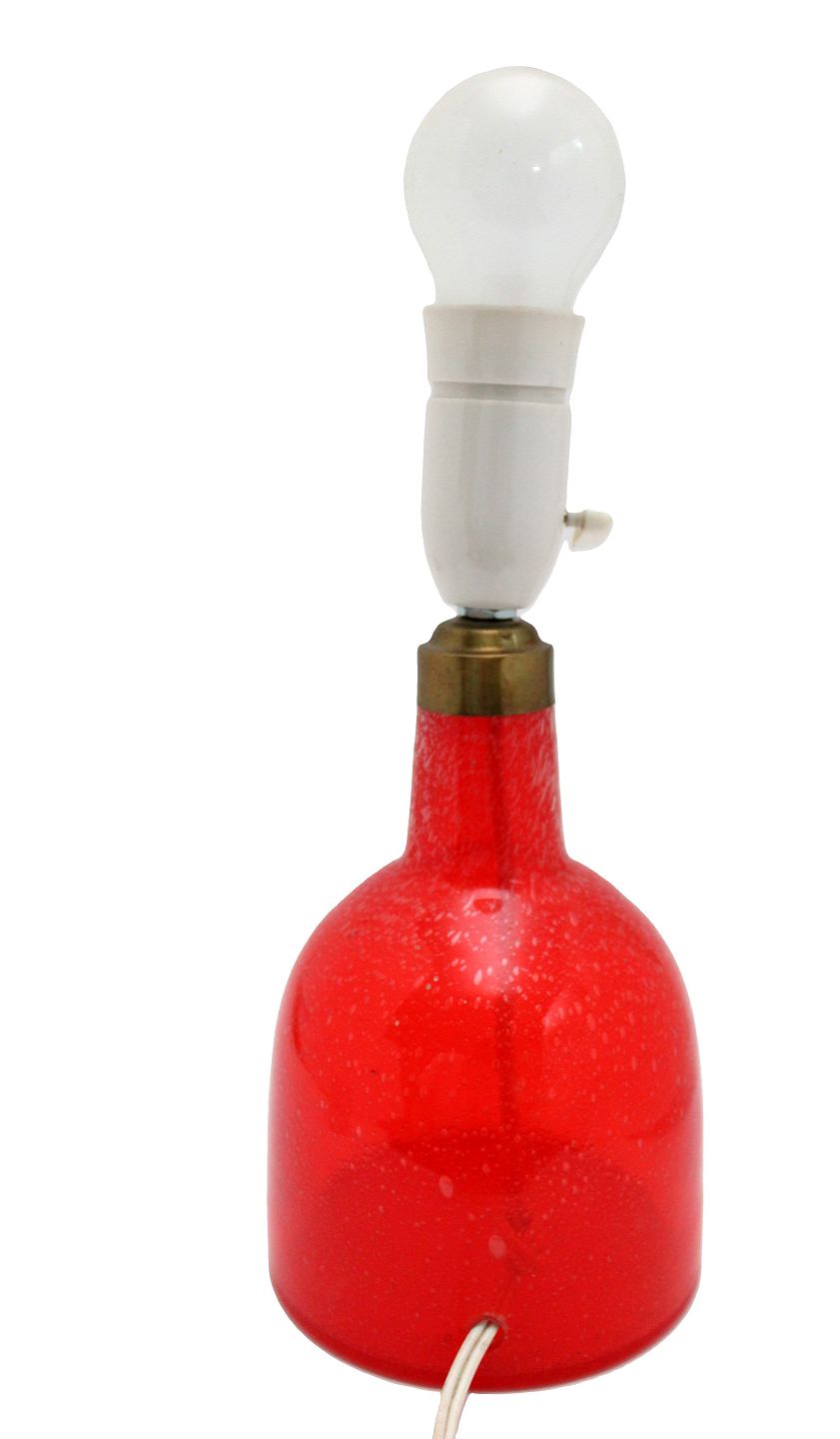 Text available in Danish: Rødorange transparent bordlampe i glas med små bobler. Messingtop. Ingen signatur eller mærke. Fatningen hælder en anelse. Højde incl. fatning 26,5 cm. Bund diameter 12 cm. Pris: 325 kr.
