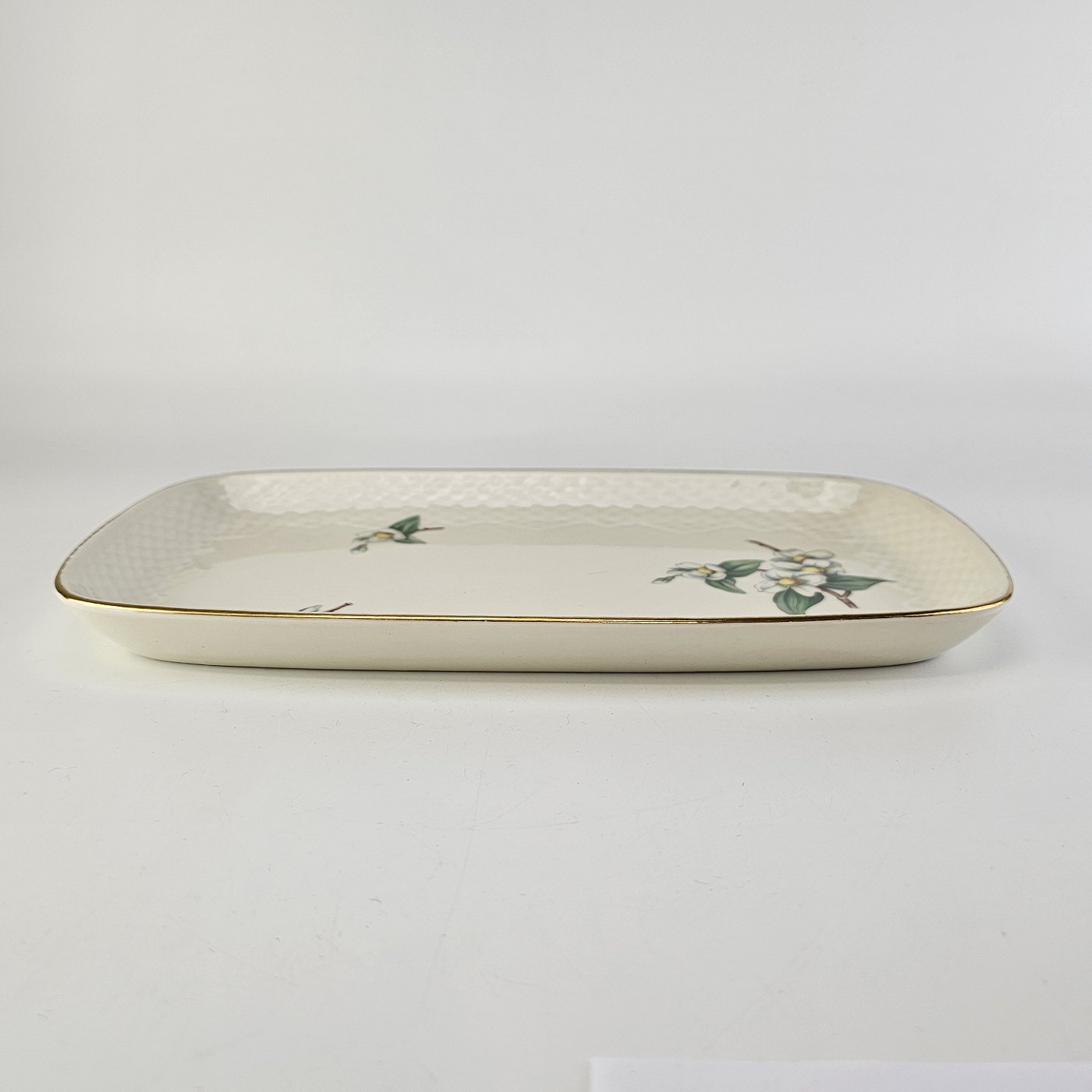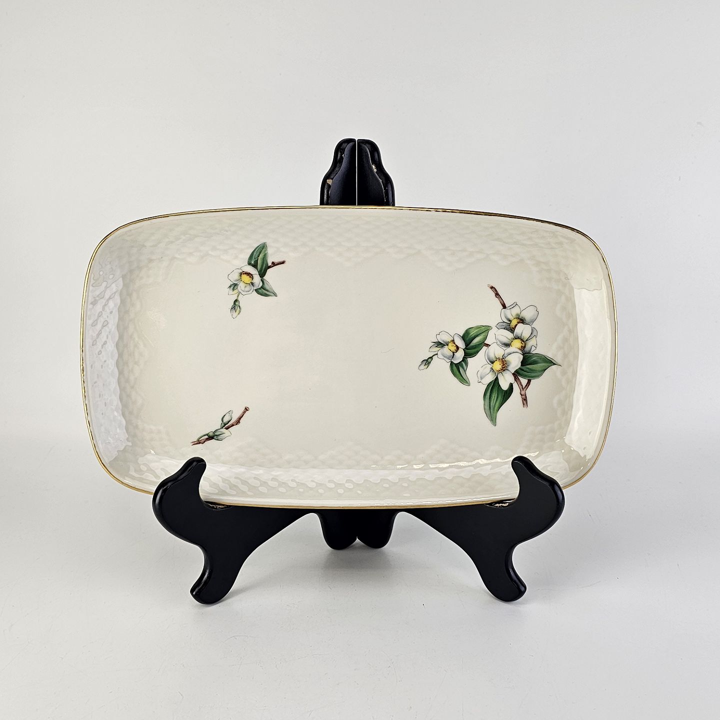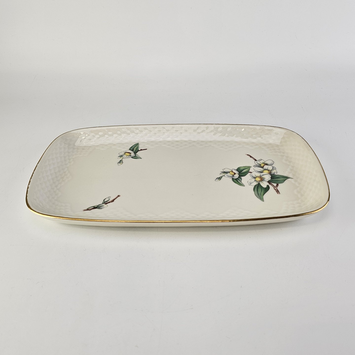 Heimdal er cremefarvet porcelæn i skælform, som dekoreret med jasminblomster, grene og en guldkant.