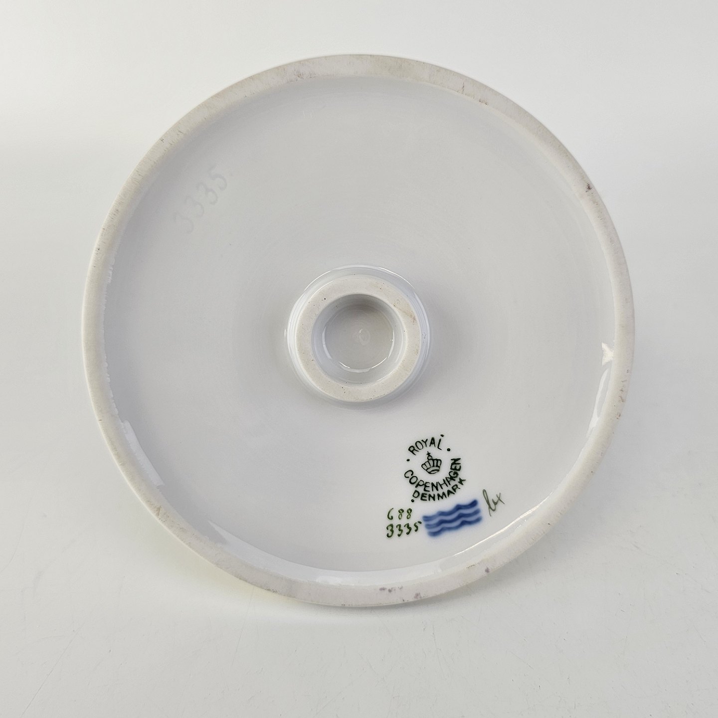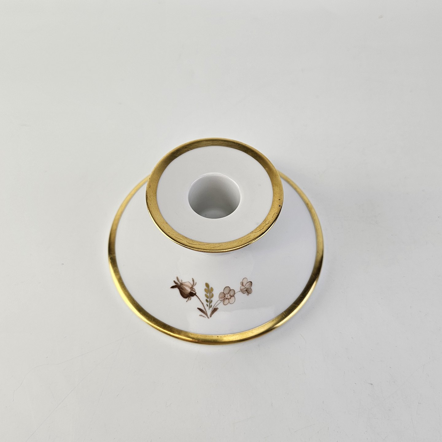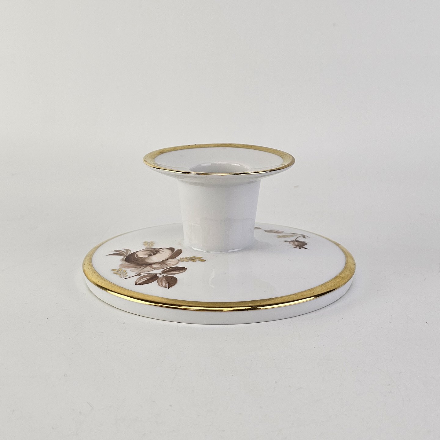 Stel i glat hvidt porcelæn dekoreret med brune roser og guldbort