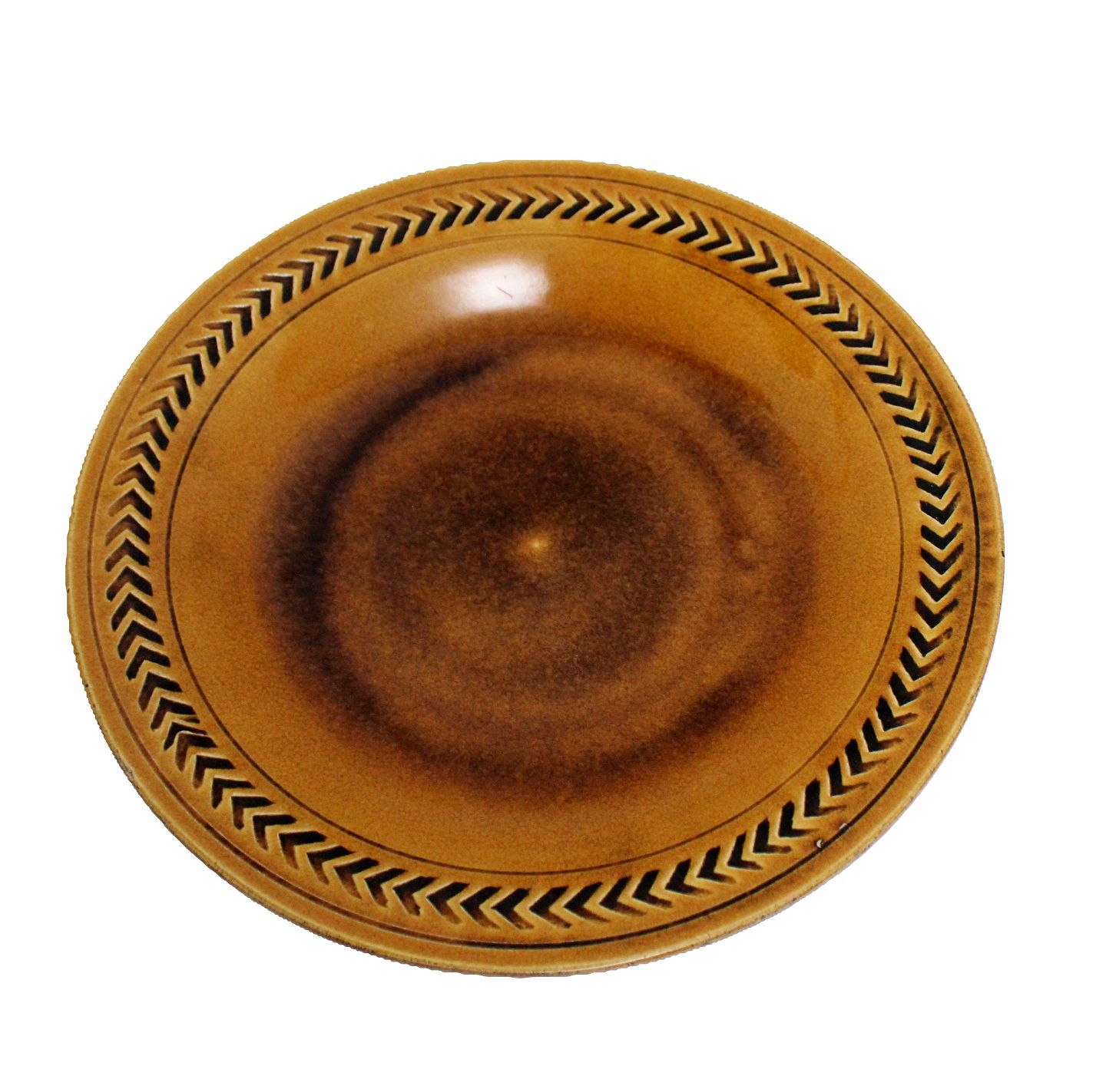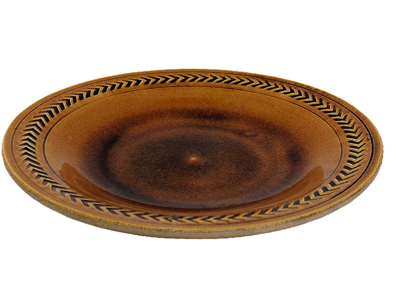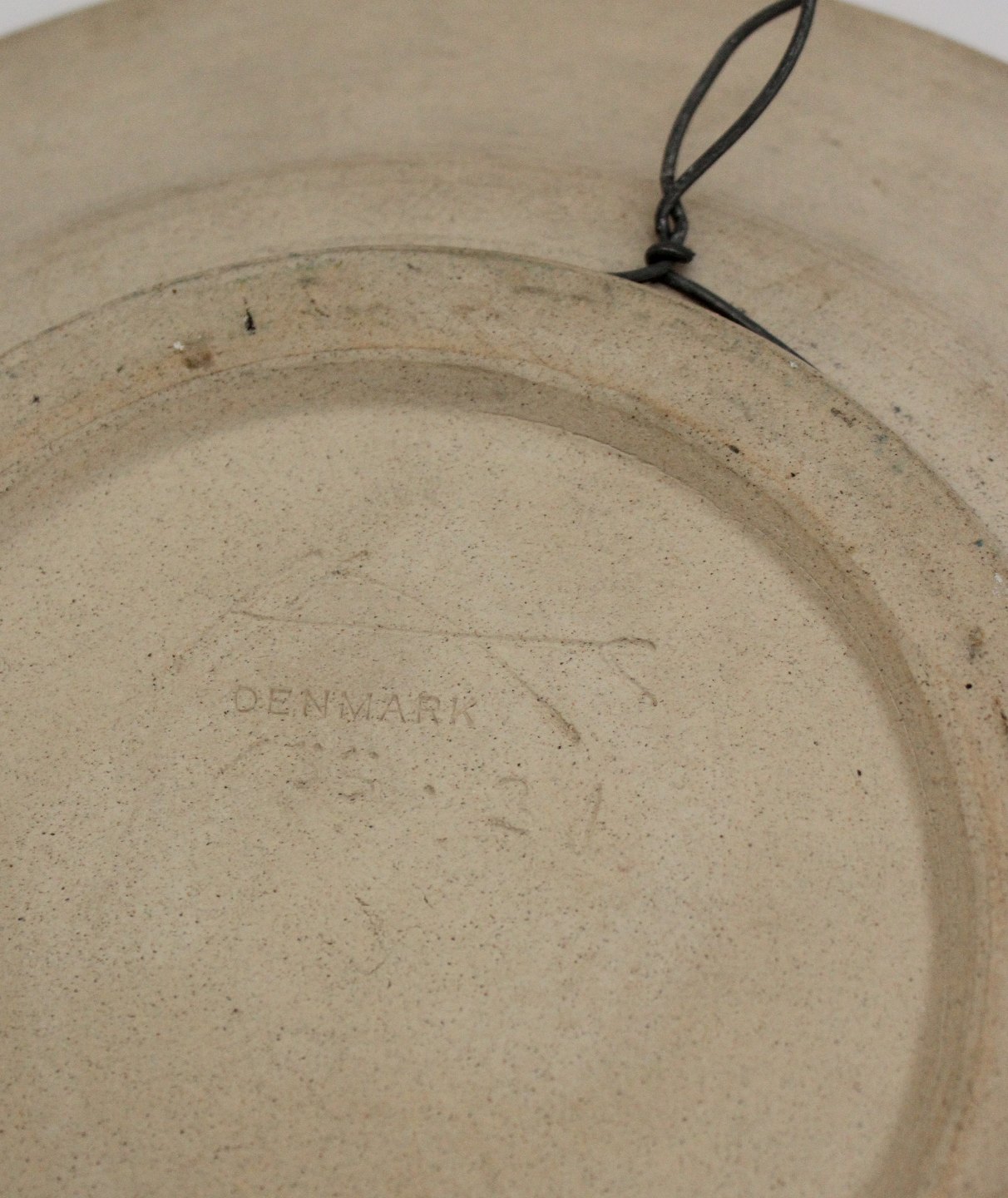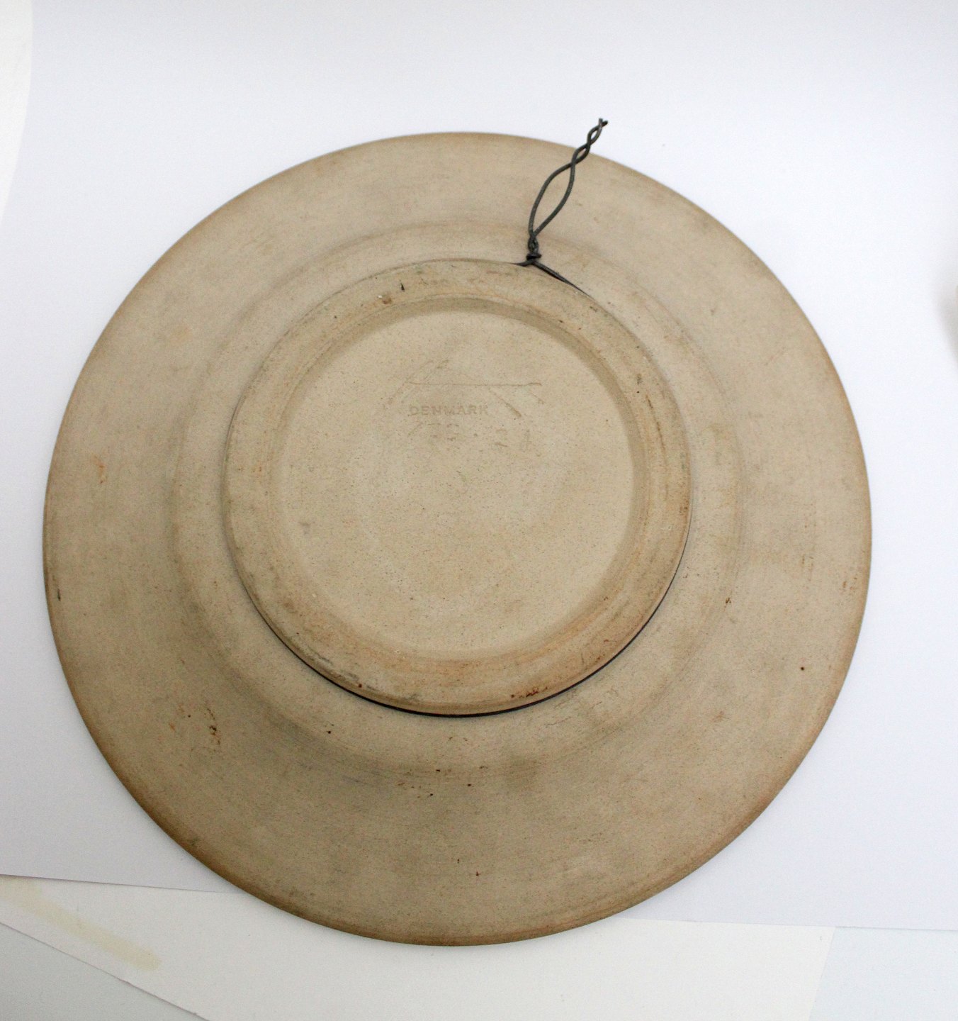 Kähler, Smuk gammelt rundt fad i Creme brulé farvet glasur og reliefmønster rundt i kanten. Nr. 155-31. Signatur HAK DENMARK. Med ophæng. Diameter 31,5 cm. Flot stand. Pris: 1950 kr.